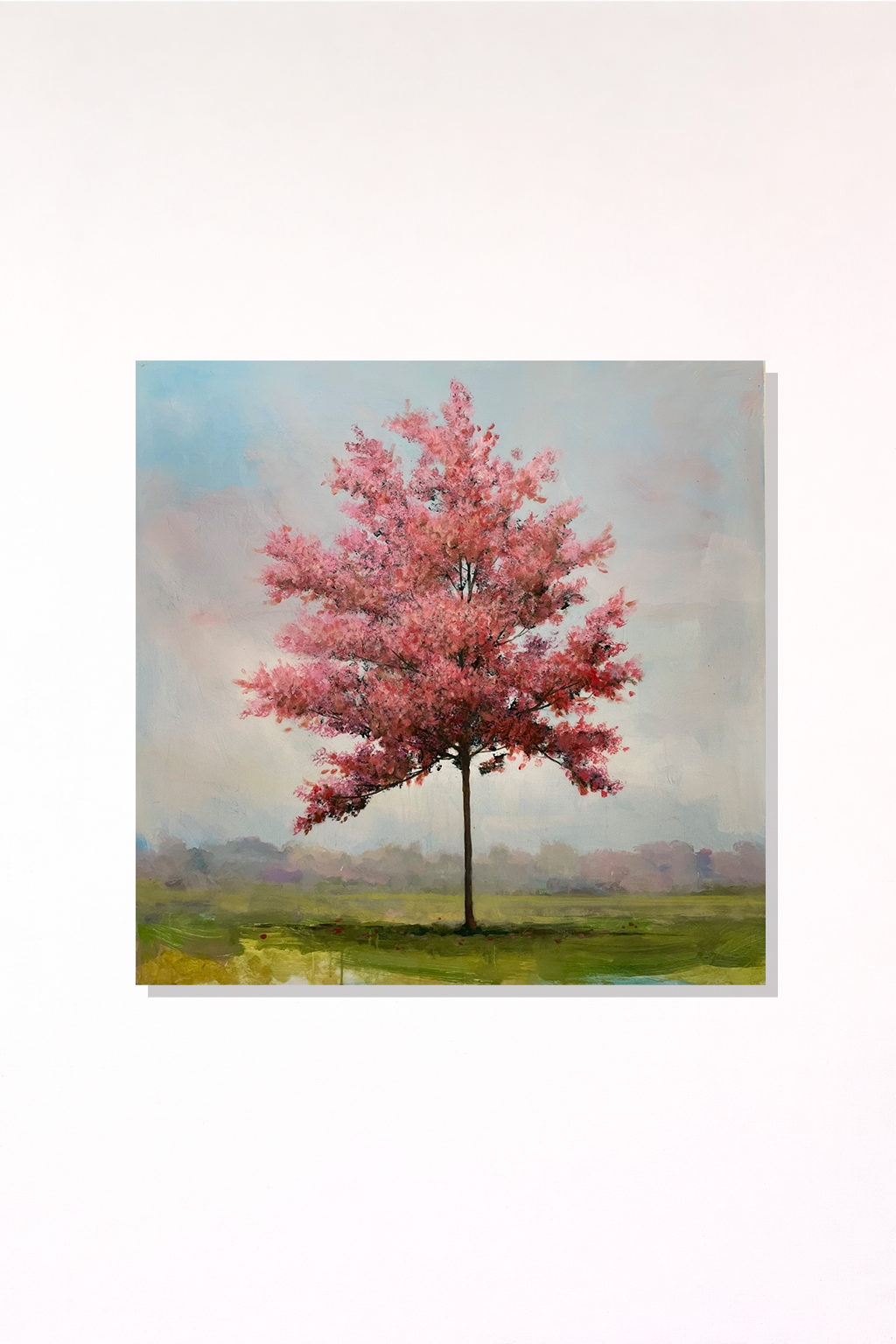 The trees that Peter paints are not a copy of an existing geography. Sometimes he paints from photographs, but most of the time these trees are reminiscences. However, whether they exist or not, he sees his work as more about technique, about how he perceives the world, rather than the reality of the world itself. A few kilometres from Montreal, Peter has a cottage in the middle of the forest, which has become his lair, a place where he loves to paint. When he gets started, he starts by painting with oil on wood, then the more creative part begins: he applies touches of acrylic paint and several coats of epoxy varnish, which he makes himself. This process was inspired by the varnishes used in the academic painting salons of the 19th century, a way of embellishing paintings and conserving them. For the artist, it is a question of staging evocative landscapes, which will awaken memories, dreams, a feeling of déjà vu in each one. But at the second reading, if we see more than a landscape but a true reflection on art, the representation of nature and the painting as an object in itself, then he will have succeeded in his wager.