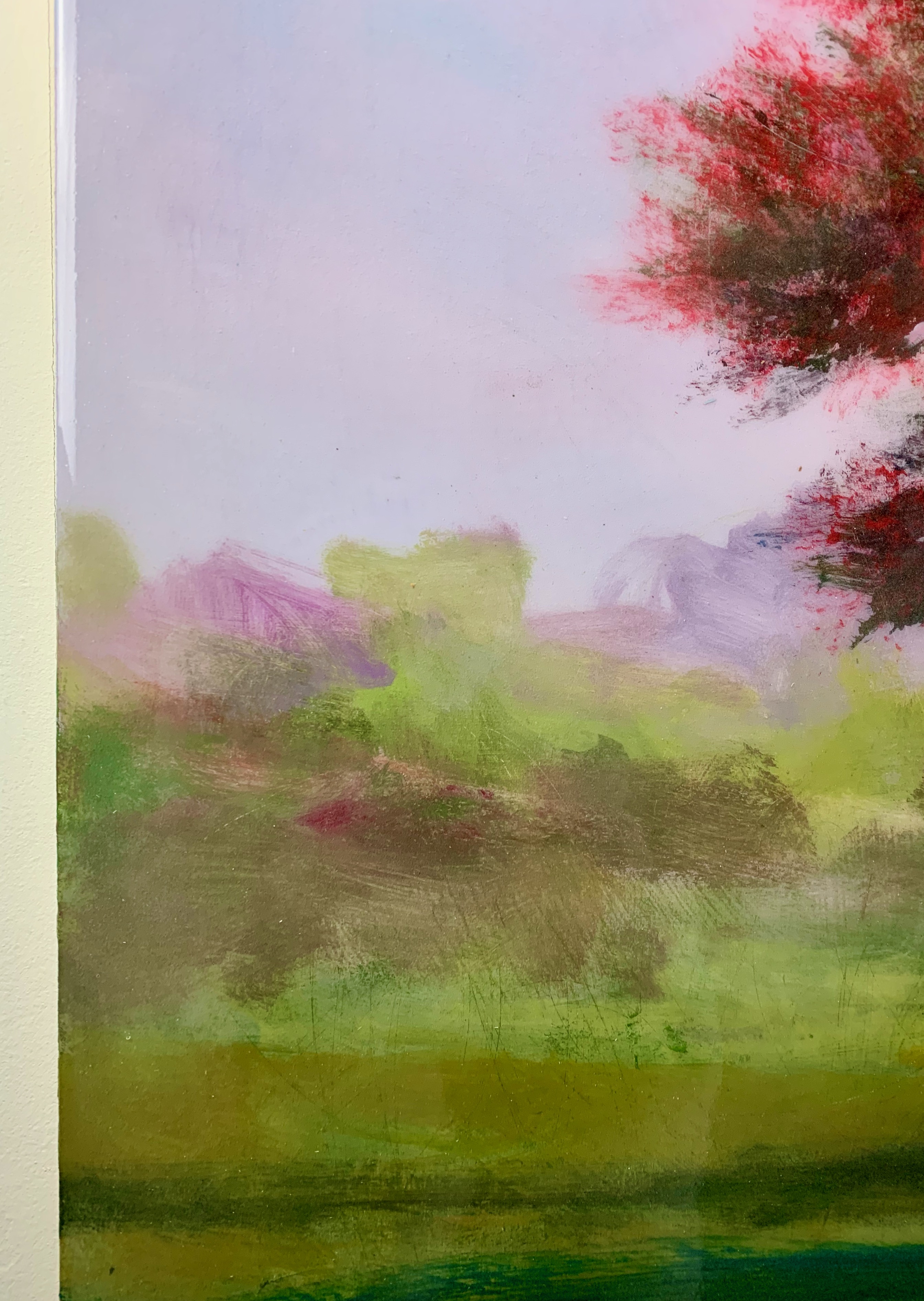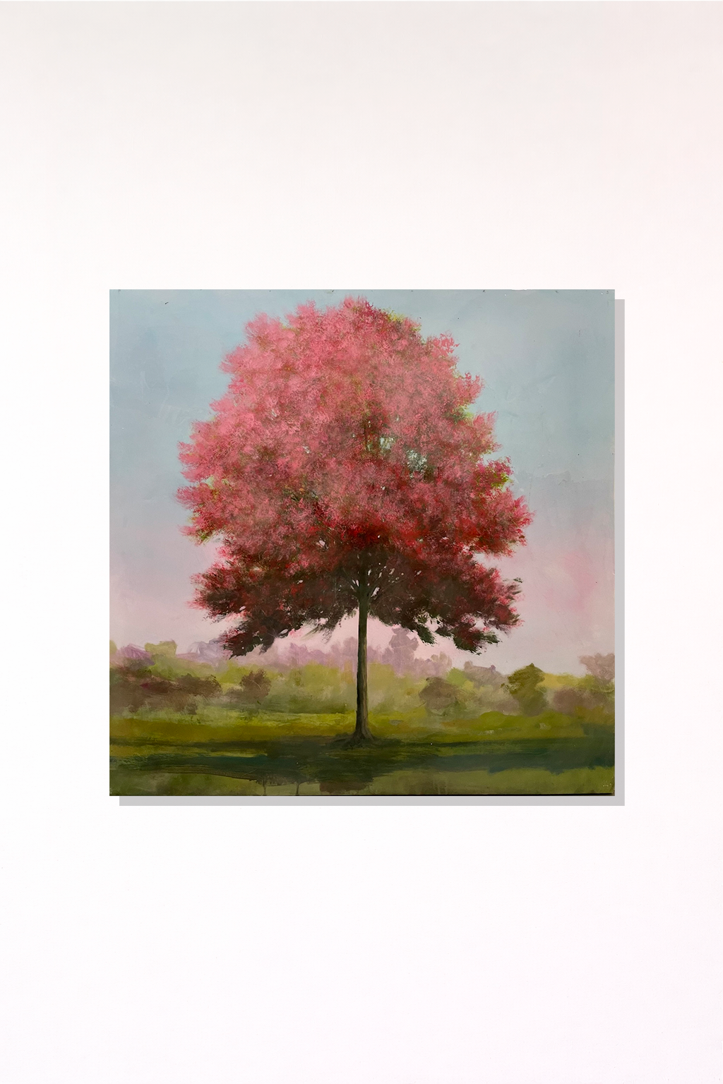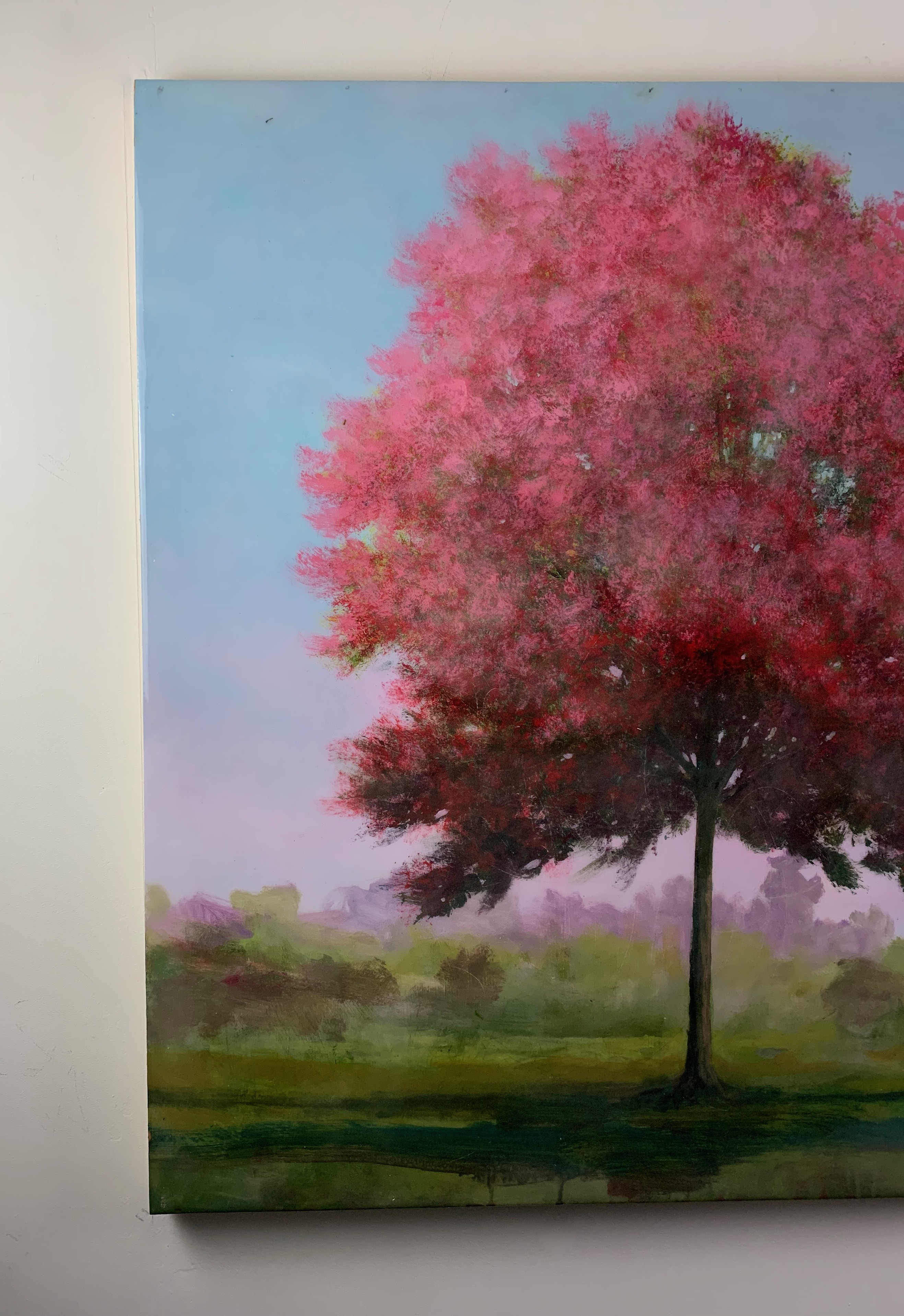 The trees that Peter paints are not a copy of an existing geography. Sometimes he paints from photographs, but most of the time these trees are reminiscences. However, whether they exist or not, he sees his work as more about technique, about how he perceives the world, rather than the reality of the world itself. A few kilometres from Montreal, Peter has a cottage in the middle of the forest, which has become his lair, a place where he loves to paint. When he gets started, he starts by painting with oil on wood, then the more creative part begins: he applies touches of acrylic paint and several coats of epoxy varnish, which he makes himself. This process was inspired by the varnishes used in the academic painting salons of the 19th century, a way of embellishing paintings and conserving them. For the artist, it is a question of staging evocative landscapes, which will awaken memories, dreams, a feeling of déjà vu in each one. But at the second reading, if we see more than a landscape but a true reflection on art, the representation of nature and the painting as an object in itself, then he will have succeeded in his wager.