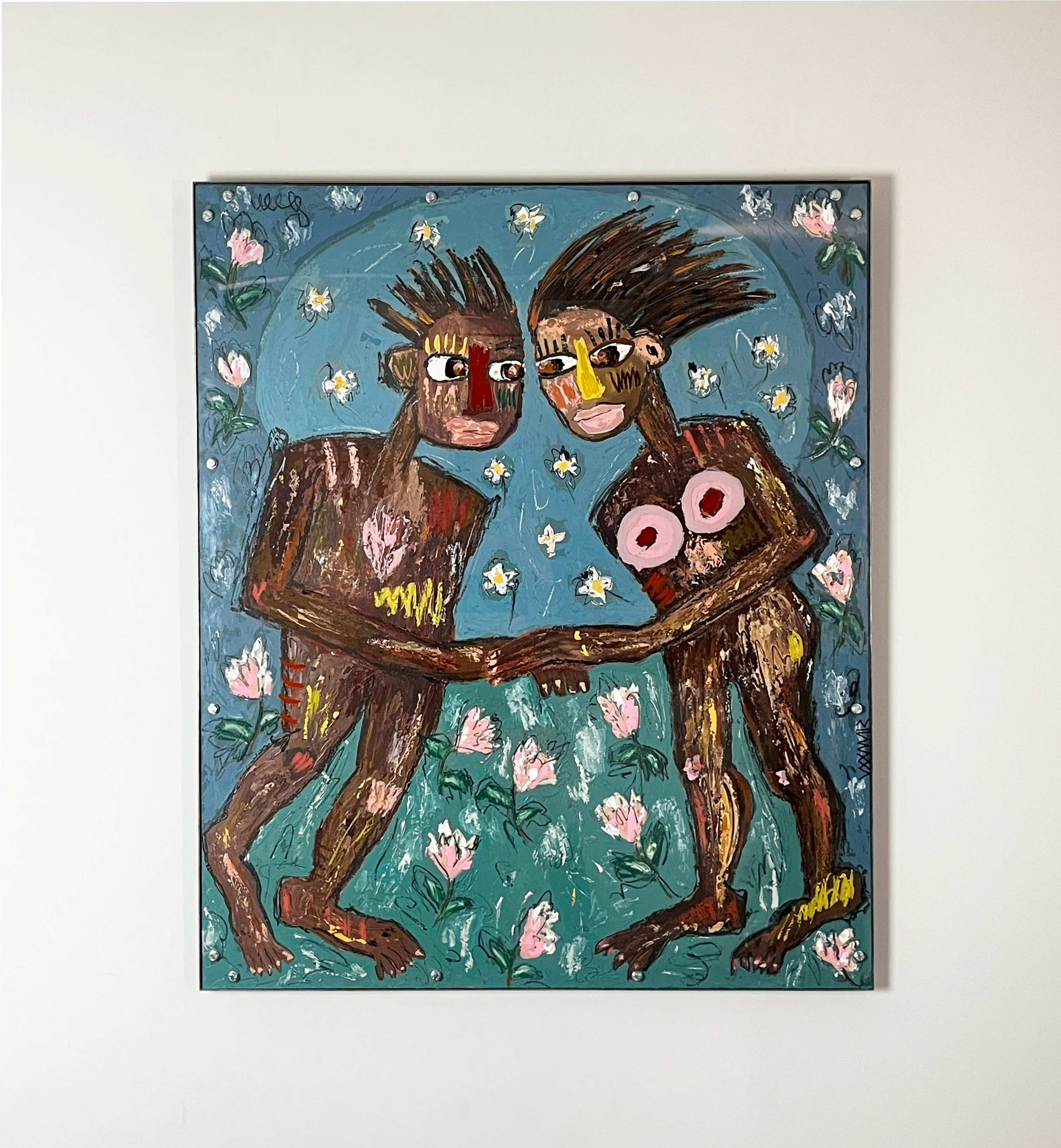 Inspired by Basquiat, Raushenberg or Combas, the work of Silvia Calmejane is however deeply personal. In each of her compositions, the artist scatters with the brush traces of her history, travels and inspirations. The words in her paintings, mysterious incantations, recall in that sense the hippie slogans of the 1970s, an important period for the artist.