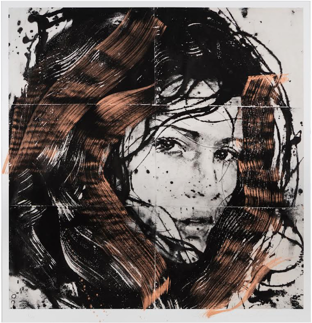 The portraits are painted in black acrylic, which is then removed and washed off with a mixture of water and bleach. This technique produces the beautiful colour palette that distinguishes her work, with shades ranging from pink to white and from black to grey. Lídia's strokes are sharp and fast, resulting in many losses and failures due to the destructive nature of bleach and the unpredictable behaviour of water. Lídia takes a unique approach to the watercolour technique. She wants the paper to suck in the water to distort and bend, for the water to flow onto the canvas, for the paint to disintegrate and for her lines to crumble under the bleach.