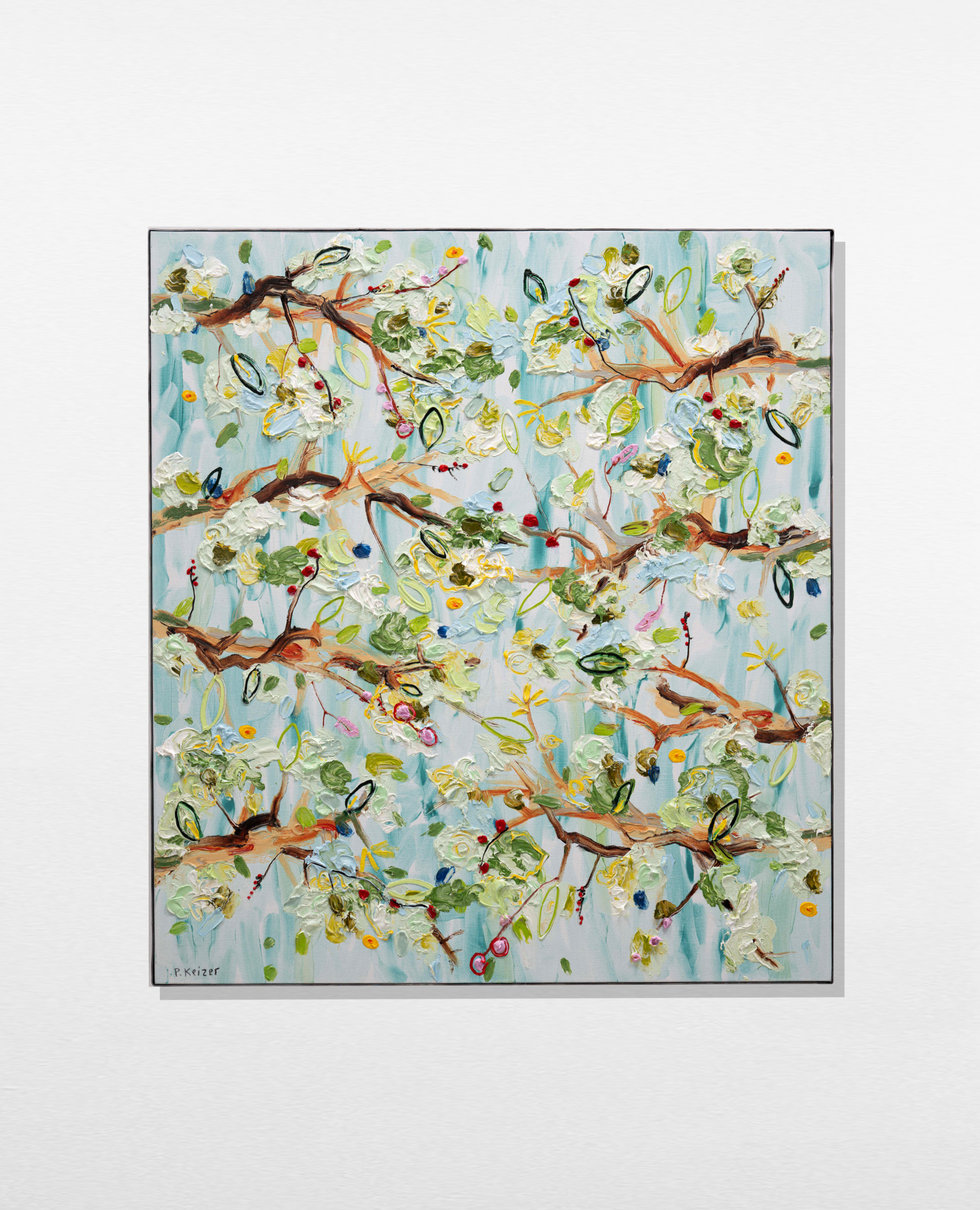 Both magnificient and absurd, Peter Keizer's work is about a world where only positive feelings arise: full of flowers, trees, mountainous landscapes and dogs. His themes are closely connected to childhood memories; as if time had turned his memories into idealized, colorful works of art. The thick oil paint is mostly used directly out of the tube, and gives a sculptural aspect to the paintings: thus enhancing the presence of the colours. "Lie on the grass and look up to the trees, if you have a young mind, you'll see what I painted" - Peter Keizer says.