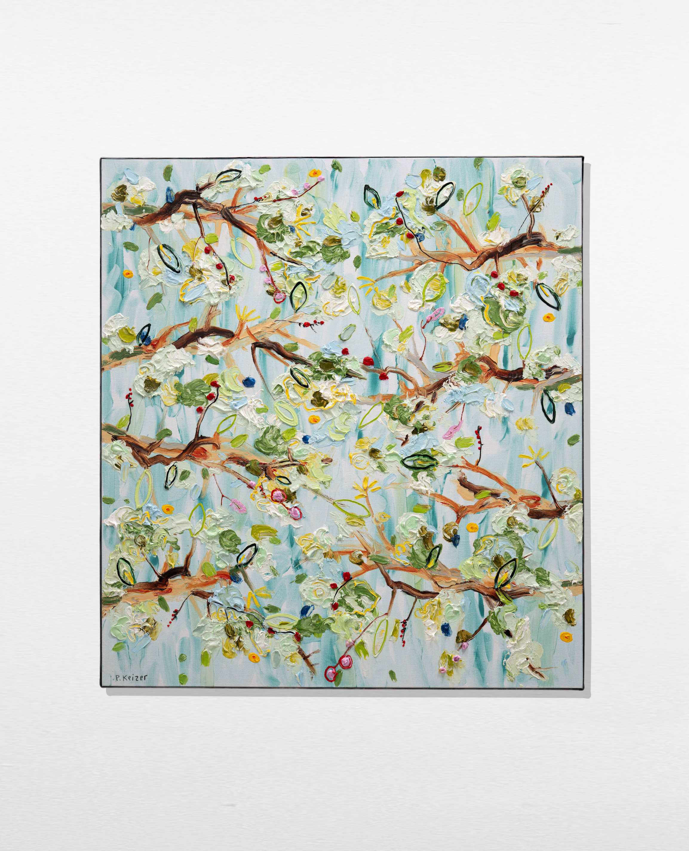 Both magnificient and absurd, Peter Keizer's work is about a world where only positive feelings arise: full of flowers, trees, mountainous landscapes and dogs. His themes are closely connected to childhood memories; as if time had turned his memories into idealized, colorful works of art. The thick oil paint is mostly used directly out of the tube, and gives a sculptural aspect to the paintings: thus enhancing the presence of the colours. "Lie on the grass and look up to the trees, if you have a young mind, you'll see what I painted" - Peter Keizer says.