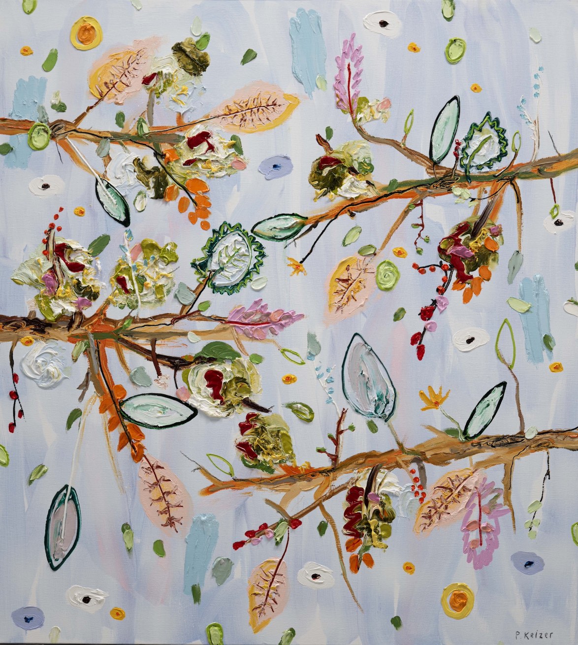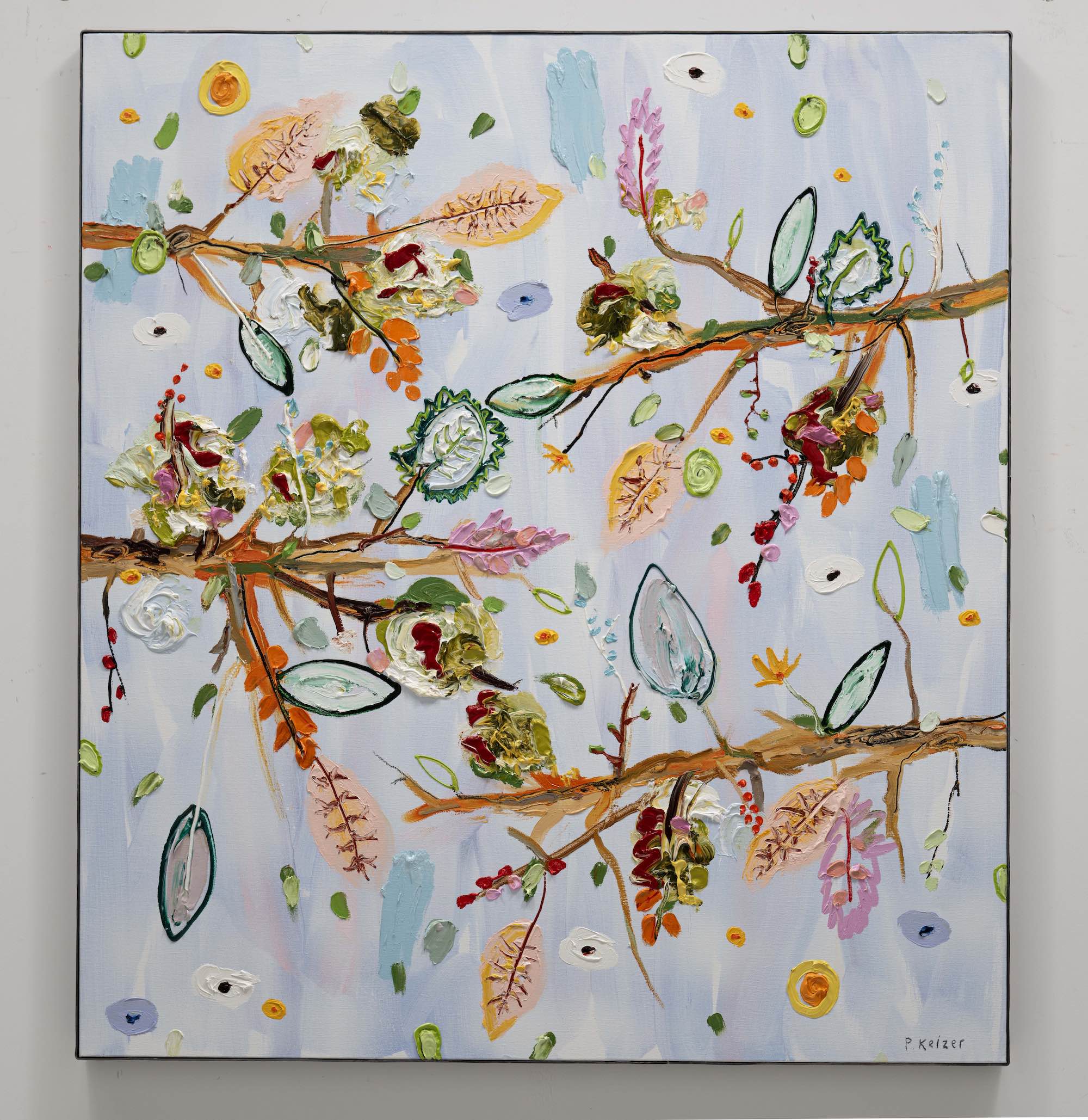 Both magnificient and absurd, Peter Keizer's work is about a world where only positive feelings arise: full of flowers, trees, mountainous landscapes and dogs. His themes are closely connected to childhood memories; as if time had turned his memories into idealized, colorful works of art. The thick oil paint is mostly used directly out of the tube, and gives a sculptural aspect to the paintings: thus enhancing the presence of the colours. "Lie on the grass and look up to the trees, if you have a young mind, you'll see what I painted" - Peter Keizer says.