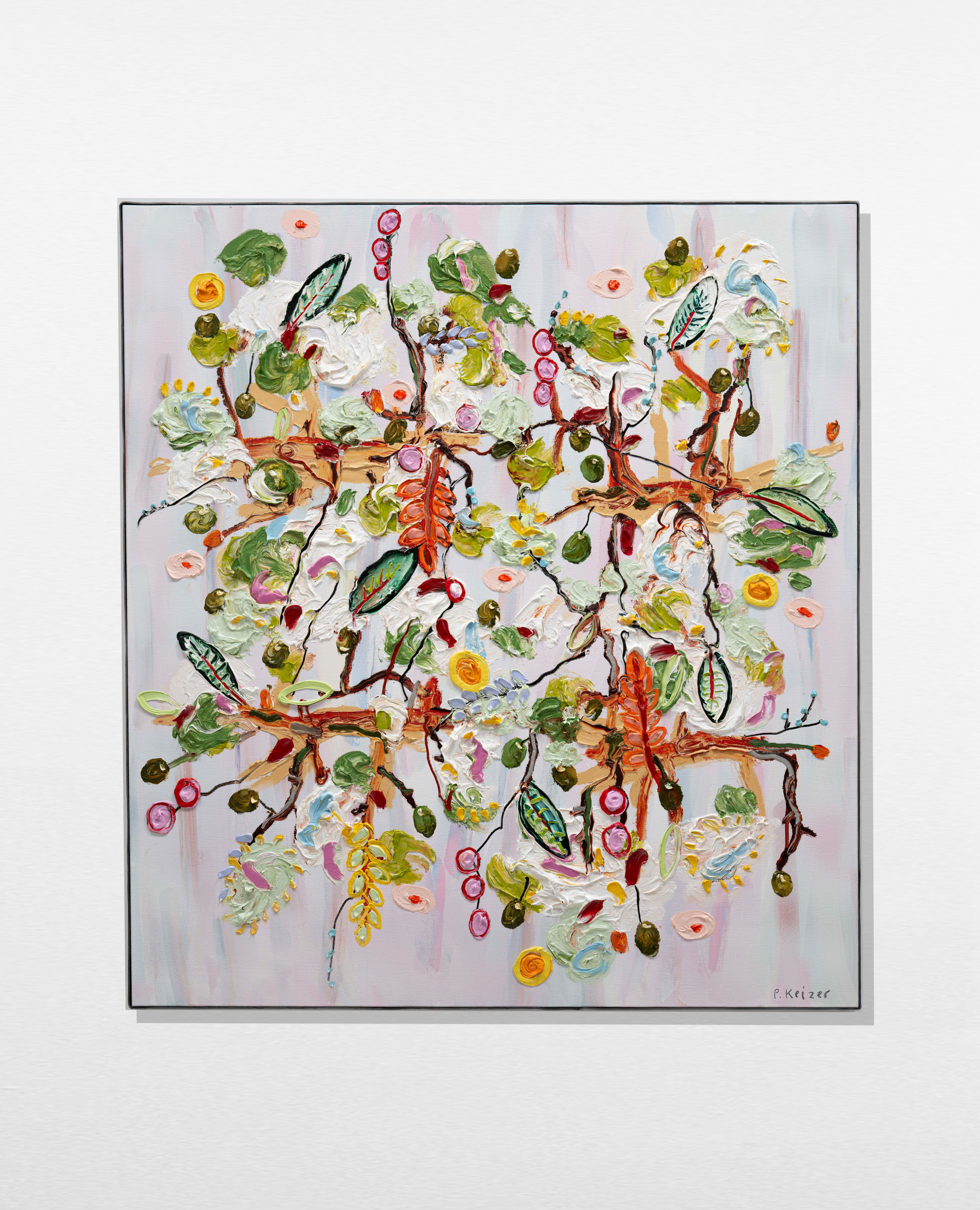 Both magnificient and absurd, Peter Keizer's work is about a world where only positive feelings arise: full of flowers, trees, mountainous landscapes and dogs. His themes are closely connected to childhood memories; as if time had turned his memories into idealized, colorful works of art. The thick oil paint is mostly used directly out of the tube, and gives a sculptural aspect to the paintings: thus enhancing the presence of the colours. "Lie on the grass and look up to the trees, if you have a young mind, you'll see what I painted" - Peter Keizer says.