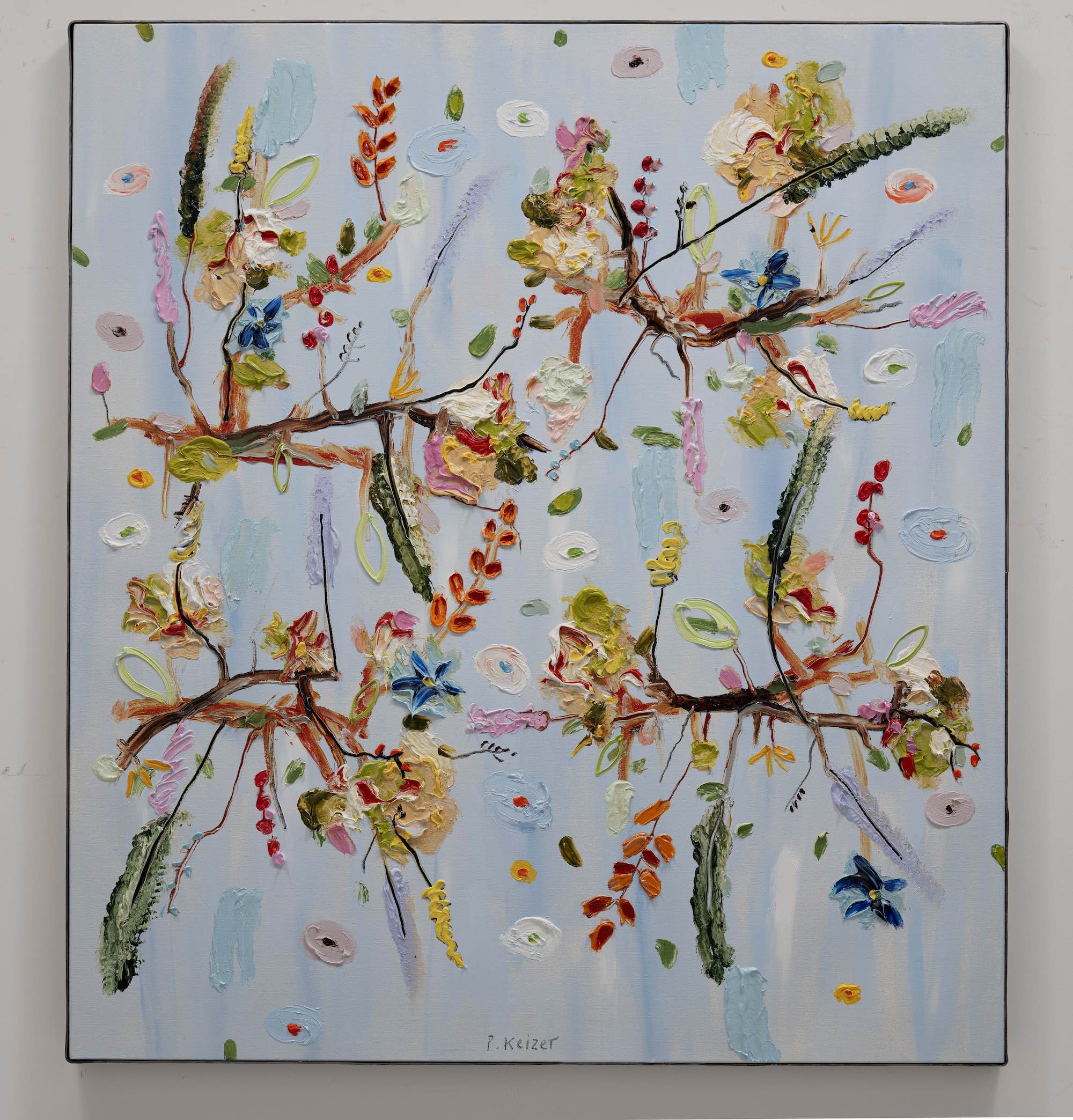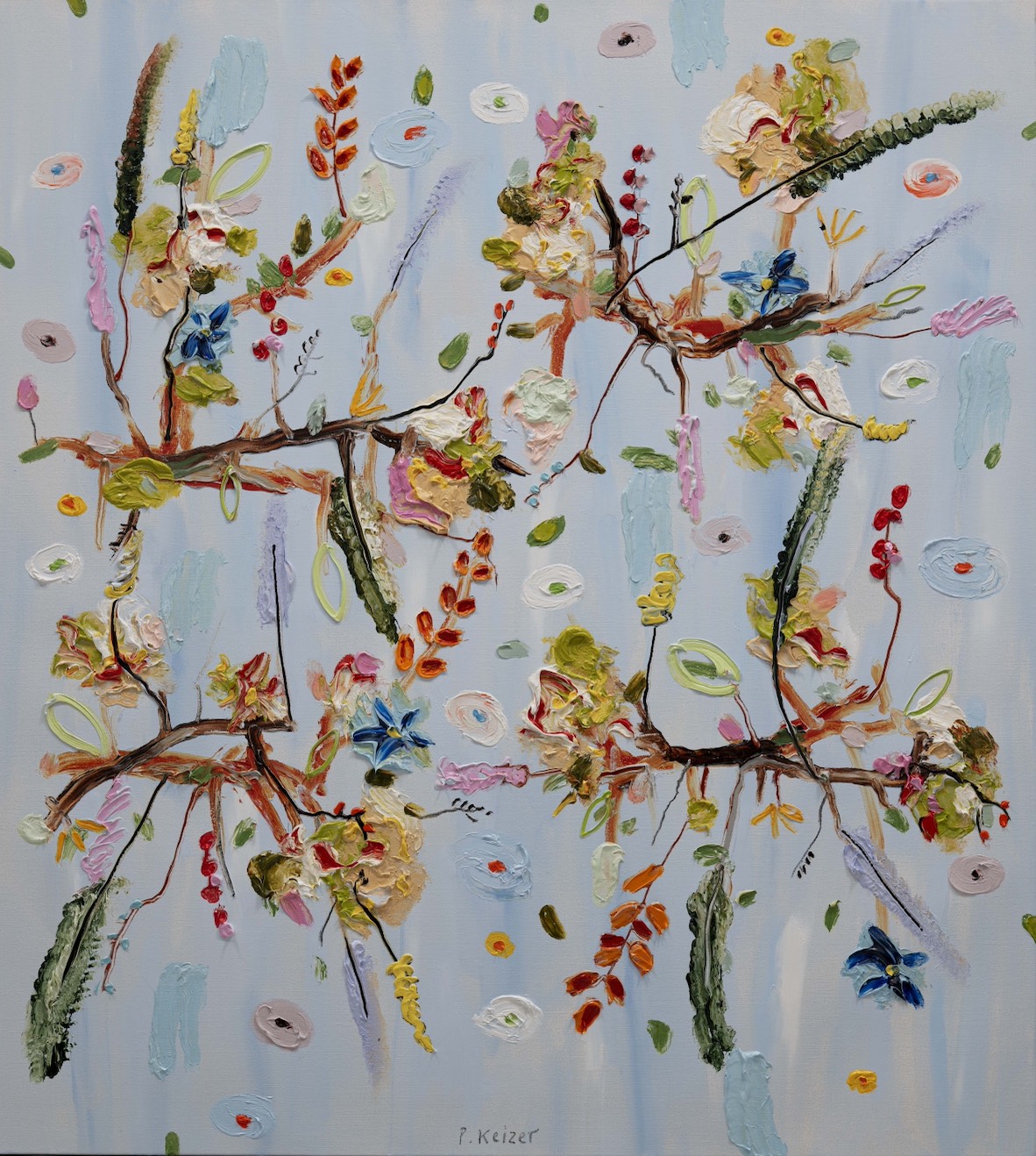 Both magnificient and absurd, Peter Keizer's work is about a world where only positive feelings arise: full of flowers, trees, mountainous landscapes  and dogs. His themes are closely connected to childhood memories; as if time had turned his memories into idealized, colorful works of art. The thick oil paint is mostly used directly out of the tube, and gives a sculptural aspect to the paintings: thus enhancing the presence of the colours. "Lie on the grass and look up to the trees, if you have a young mind, you'll see what I painted" - Peter Keizer says.