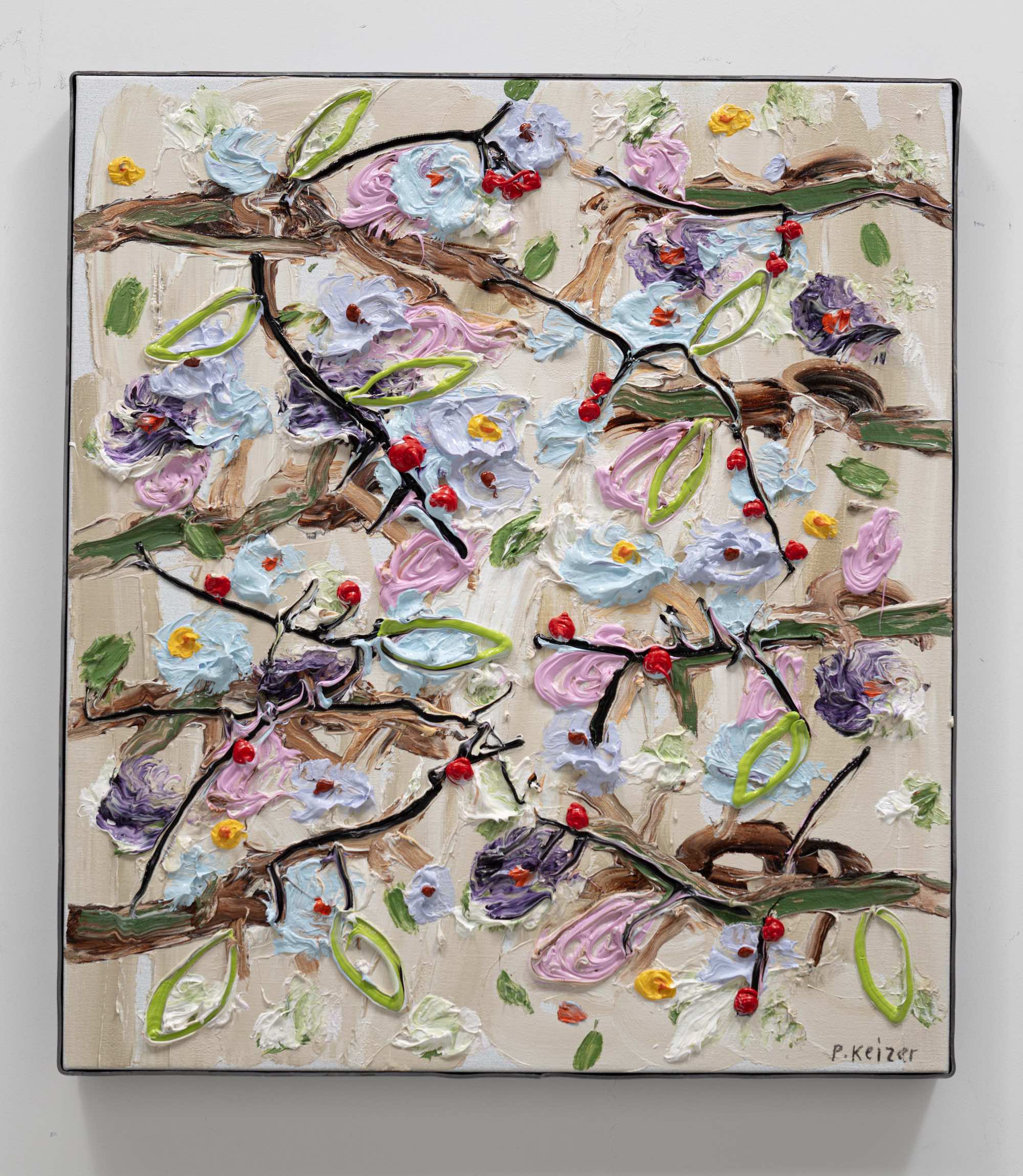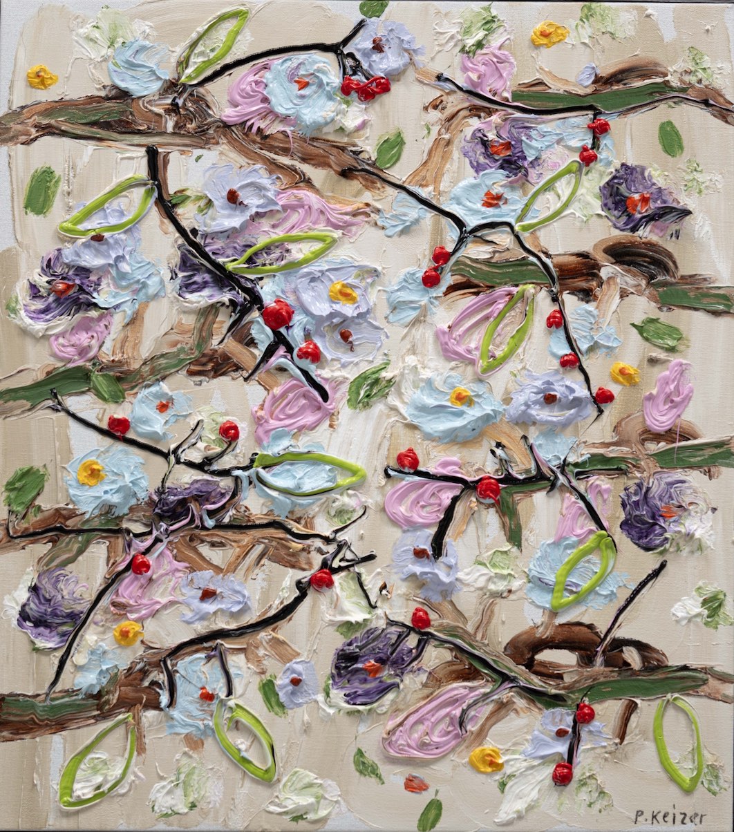 Both magnificient and absurd, Peter Keizer's work is about a world where only positive feelings arise: full of flowers, trees, mountainous landscapes  and dogs. His themes are closely connected to childhood memories; as if time had turned his memories into idealized, colorful works of art. The thick oil paint is mostly used directly out of the tube, and gives a sculptural aspect to the paintings: thus enhancing the presence of the colours. "Lie on the grass and look up to the trees, if you have a young mind, you'll see what I painted" - Peter Keizer says.