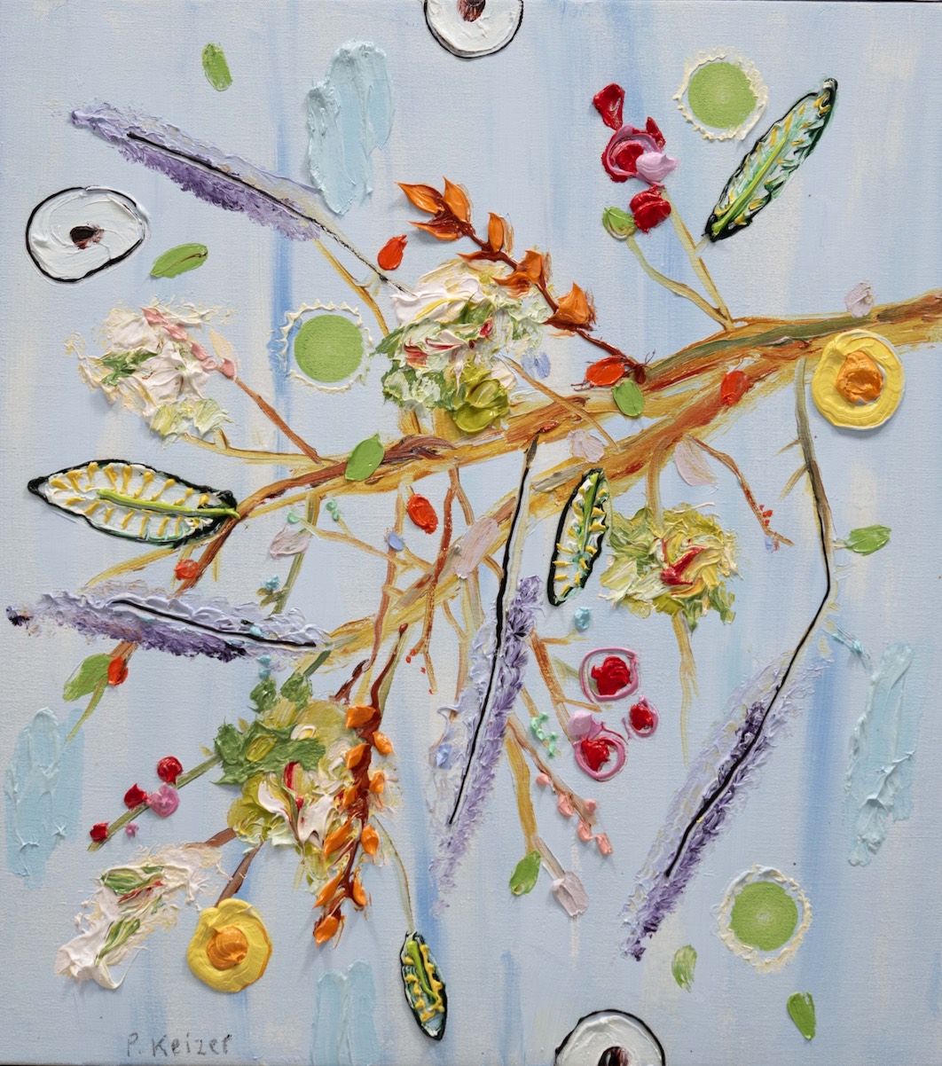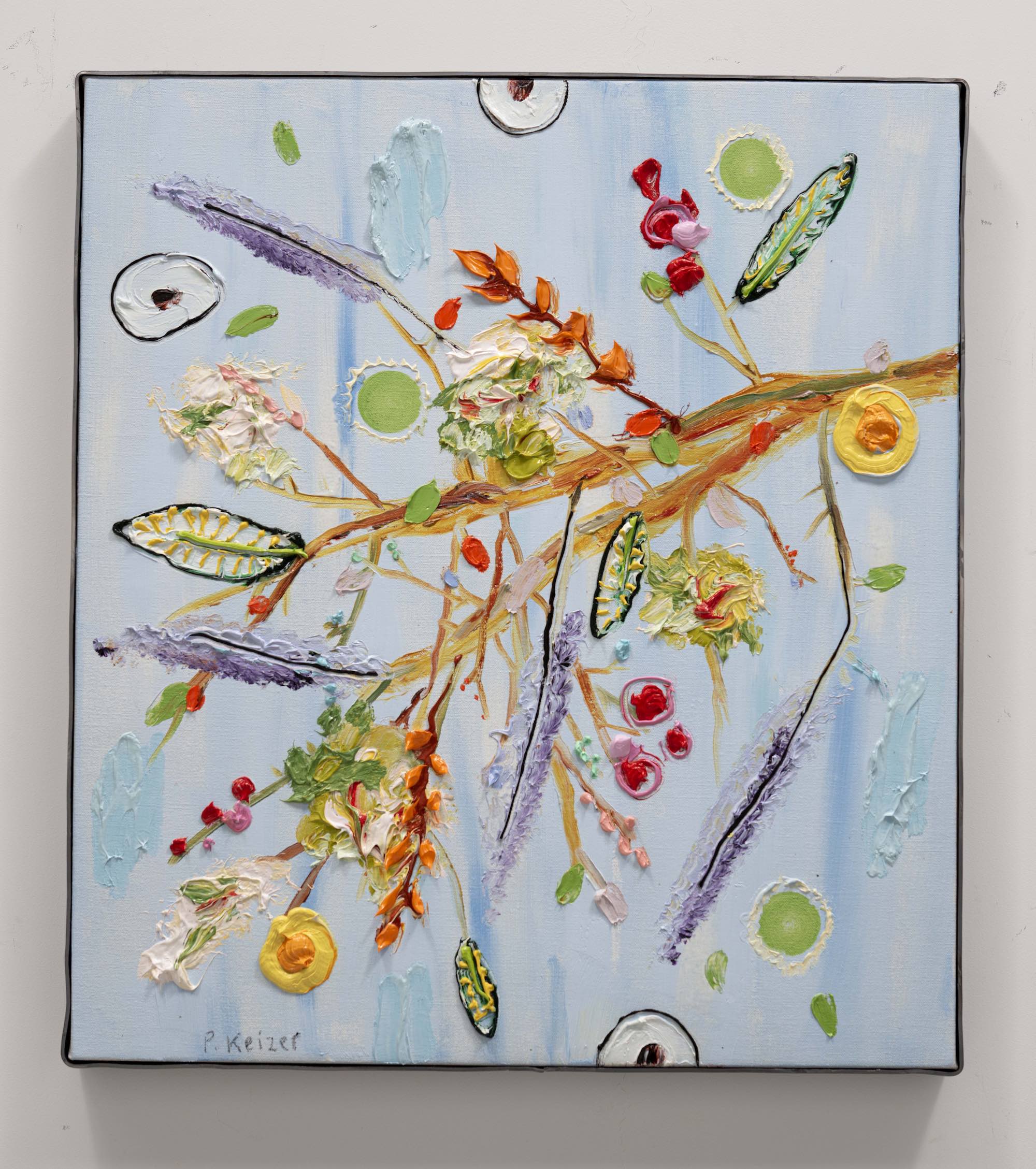 Both magnificient and absurd, Peter Keizer's work is about a world where only positive feelings arise: full of flowers, trees, mountainous landscapes and dogs. His themes are closely connected to childhood memories; as if time had turned his memories into idealized, colorful works of art. The thick oil paint is mostly used directly out of the tube, and gives a sculptural aspect to the paintings: thus enhancing the presence of the colours. "Lie on the grass and look up to the trees, if you have a young mind, you'll see what I painted" - Peter Keizer says.