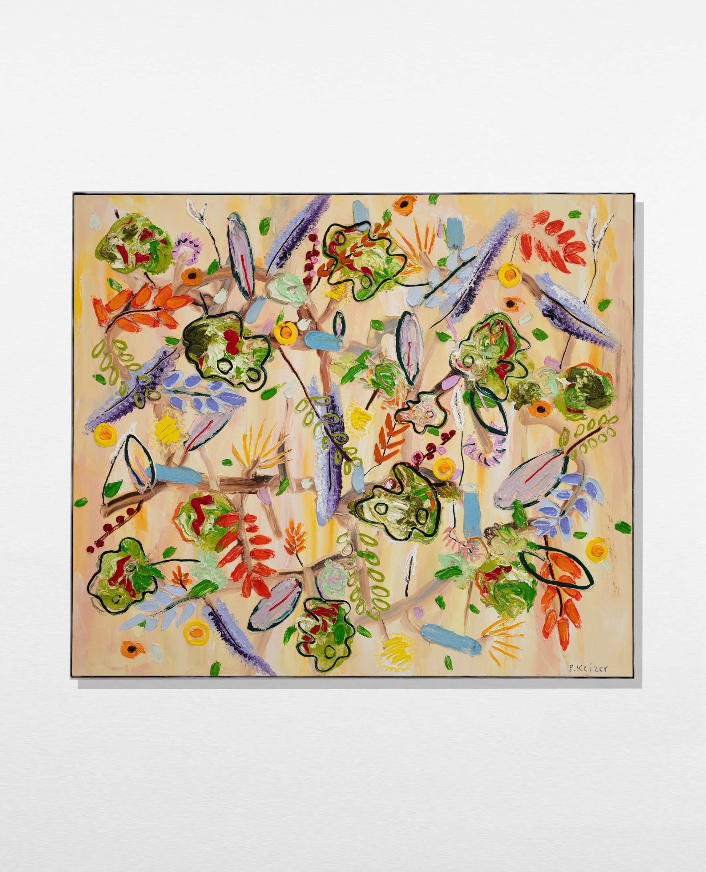 Both magnificient and absurd, Peter Keizer's work is about a world where only positive feelings arise: full of flowers, trees, mountainous landscapes and dogs. His themes are closely connected to childhood memories; as if time had turned his memories into idealized, colorful works of art. The thick oil paint is mostly used directly out of the tube, and gives a sculptural aspect to the paintings: thus enhancing the presence of the colours. "Lie on the grass and look up to the trees, if you have a young mind, you'll see what I painted" - Peter Keizer says.