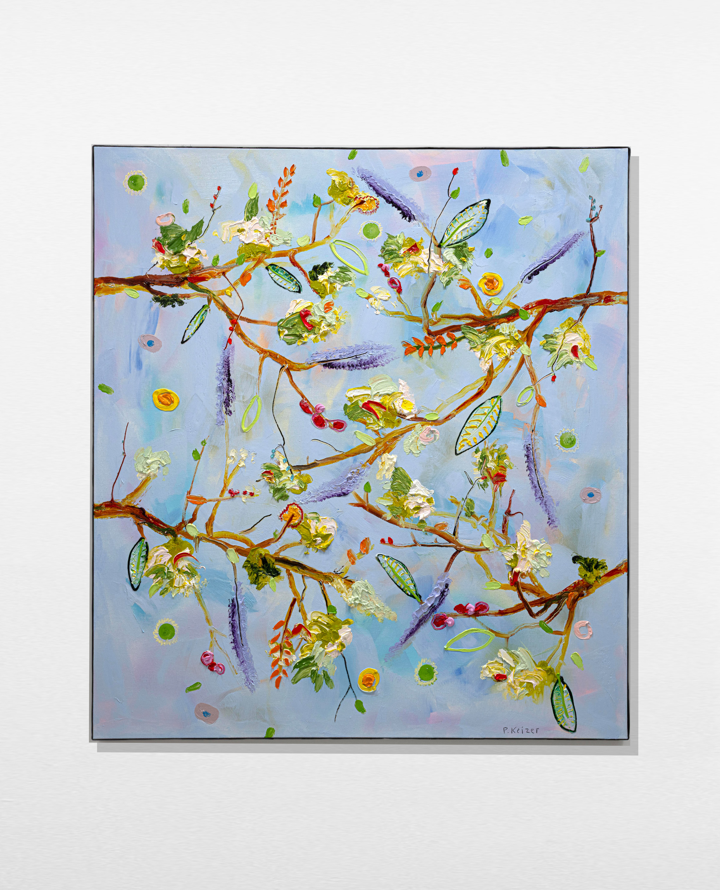 Both magnificient and absurd, Peter Keizer's work is about a world where only positive feelings arise: full of flowers, trees, mountainous landscapes  and dogs. His themes are closely connected to childhood memories; as if time had turned his memories into idealized, colorful works of art. The thick oil paint is mostly used directly out of the tube, and gives a sculptural aspect to the paintings: thus enhancing the presence of the colours. "Lie on the grass and look up to the trees, if you have a young mind, you'll see what I painted" - Peter Keizer says.