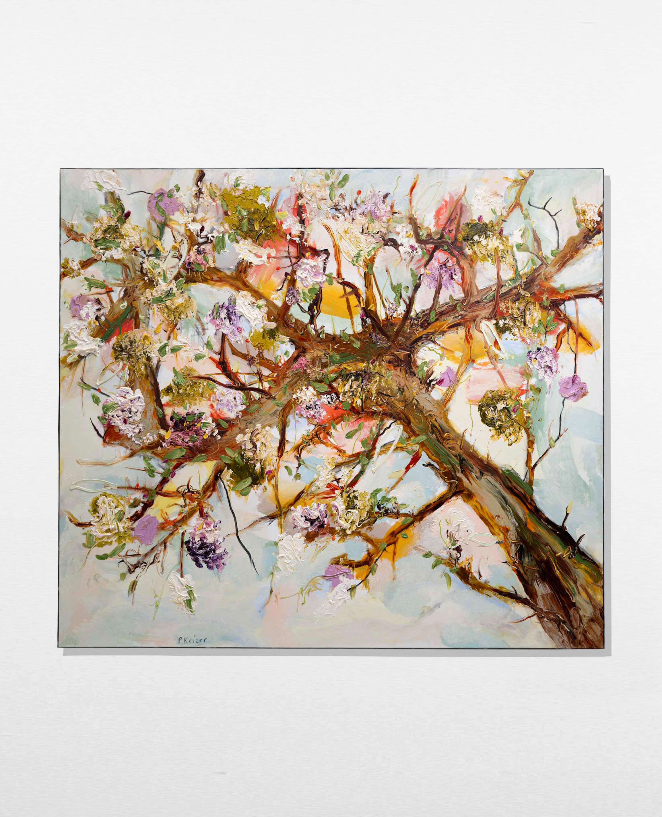 Both magnificient and absurd, Peter Keizer's work is about a world where only positive feelings arise: full of flowers, trees, mountainous landscapes  and dogs. His themes are closely connected to childhood memories; as if time had turned his memories into idealized, colorful works of art. The thick oil paint is mostly used directly out of the tube, and gives a sculptural aspect to the paintings: thus enhancing the presence of the colours. "Lie on the grass and look up to the trees, if you have a young mind, you'll see what I painted" - Peter Keizer says.