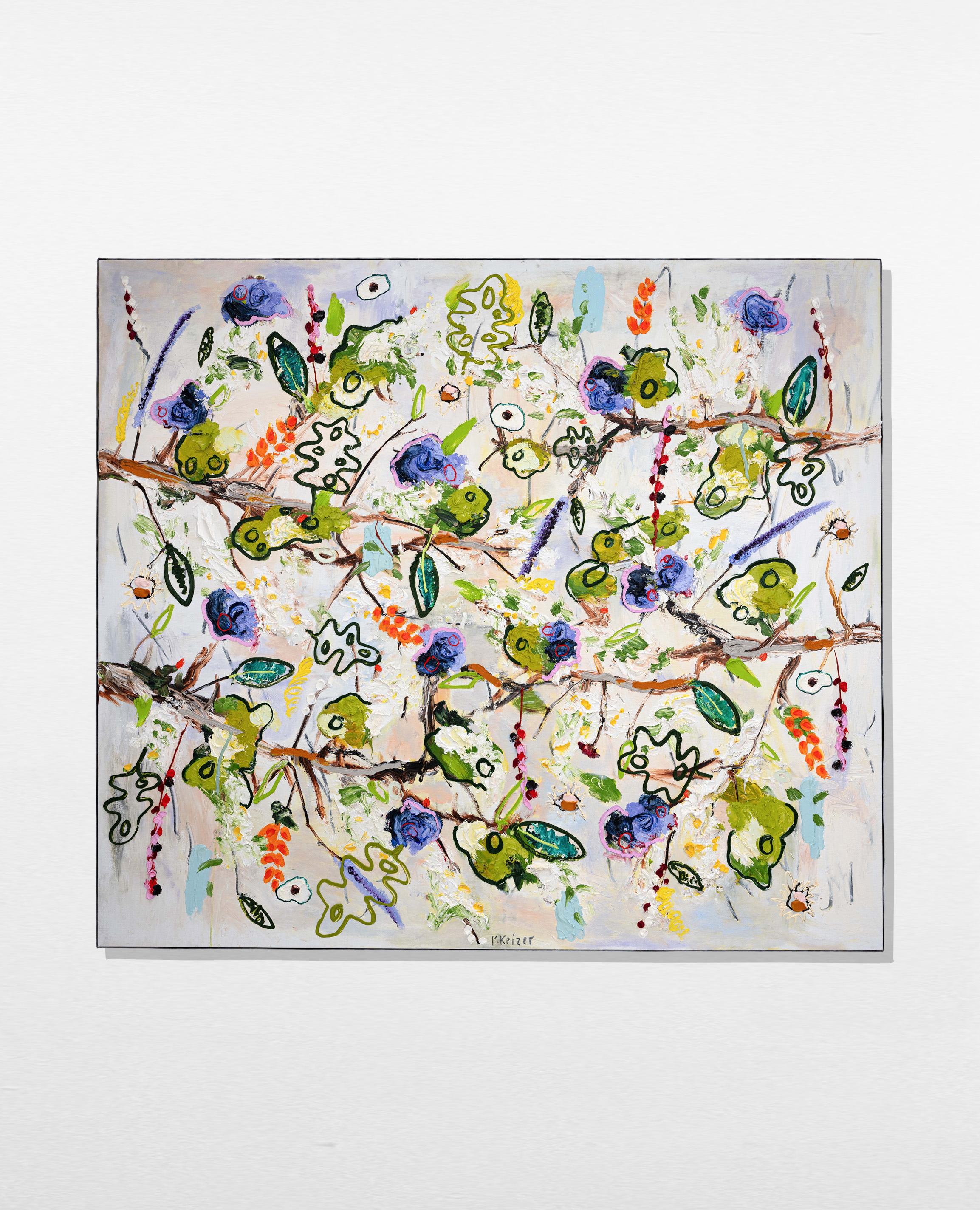 Both magnificient and absurd, Peter Keizer's work is about a world where only positive feelings arise: full of flowers, trees, mountainous landscapes and dogs. His themes are closely connected to childhood memories; as if time had turned his memories into idealized, colorful works of art. The thick oil paint is mostly used directly out of the tube, and gives a sculptural aspect to the paintings: thus enhancing the presence of the colours. "Lie on the grass and look up to the trees, if you have a young mind, you'll see what I painted" - Peter Keizer says.