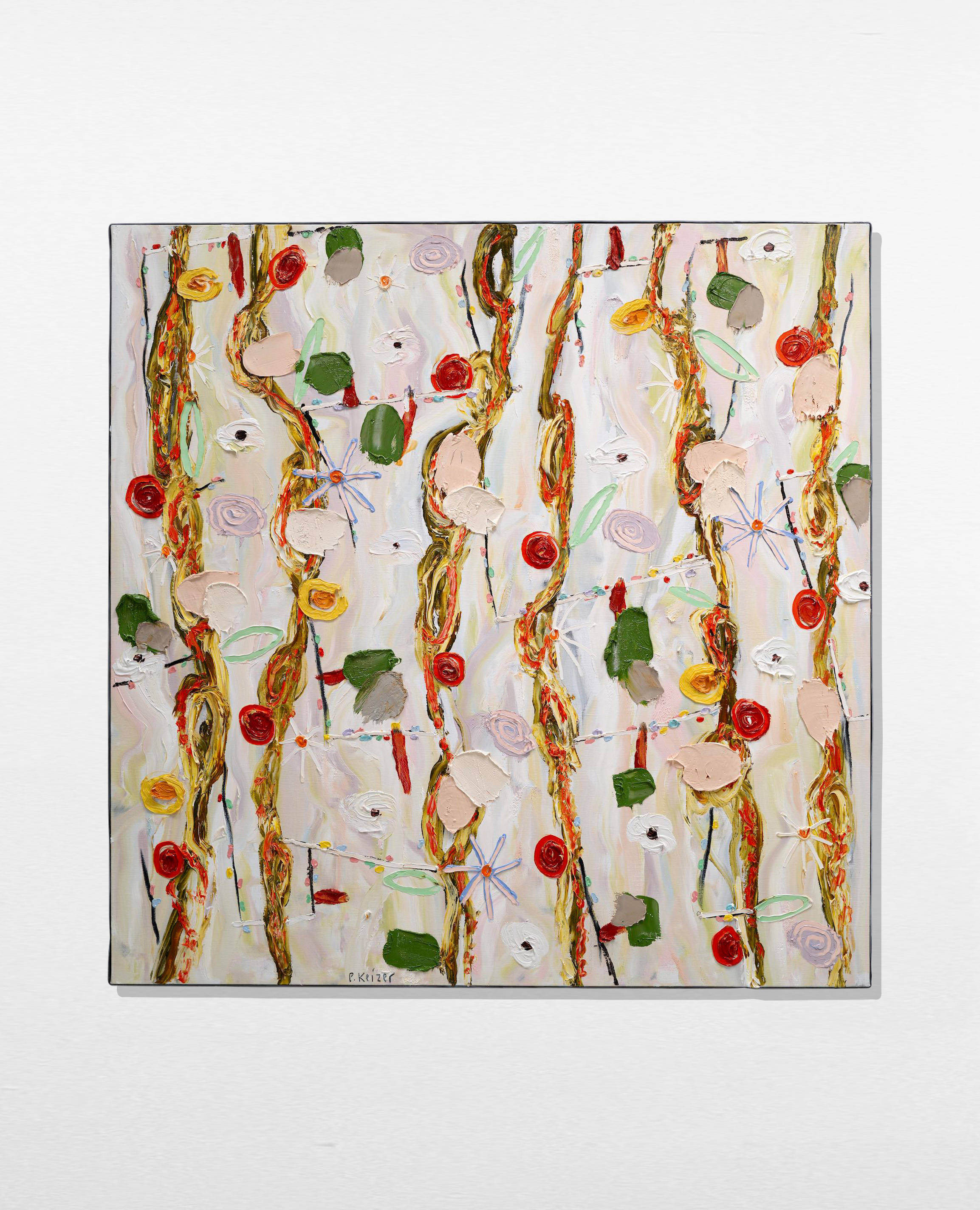 Both magnificient and absurd, Peter Keizer's work is about a world where only positive feelings arise: full of flowers, trees, mountainous landscapes and dogs. His themes are closely connected to childhood memories; as if time had turned his memories into idealized, colorful works of art. The thick oil paint is mostly used directly out of the tube, and gives a sculptural aspect to the paintings: thus enhancing the presence of the colours. "Lie on the grass and look up to the trees, if you have a young mind, you'll see what I painted" - Peter Keizer says.