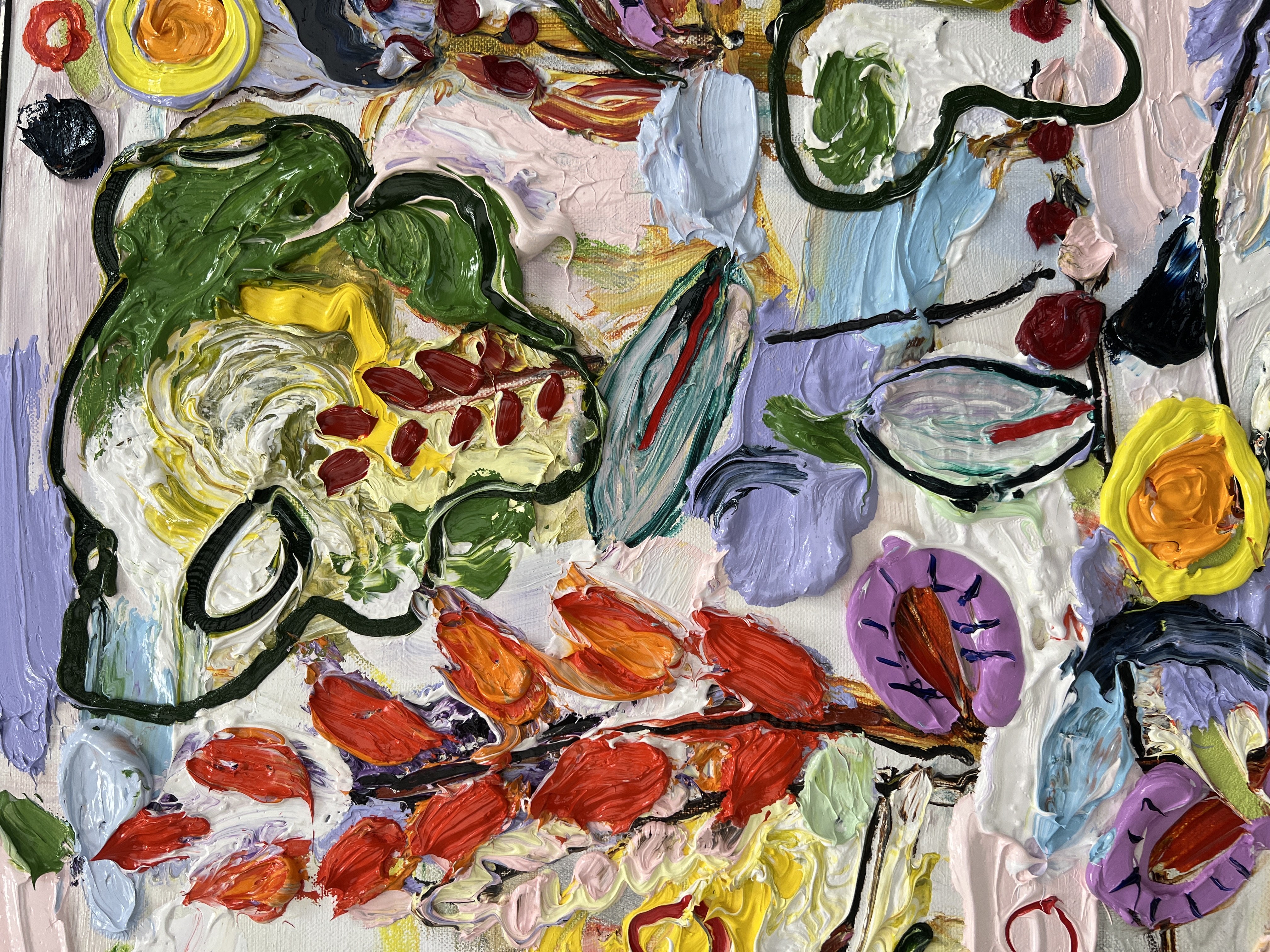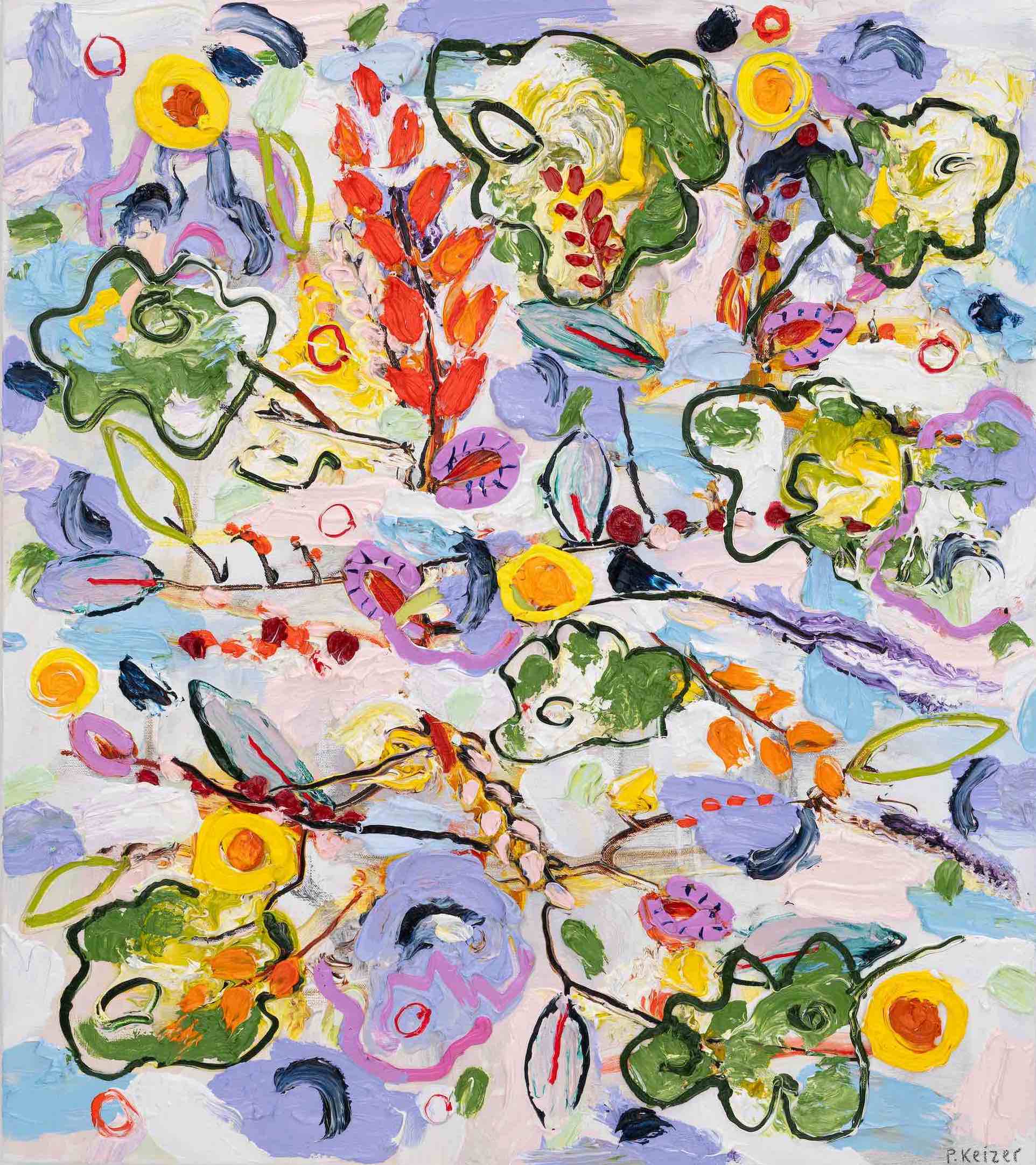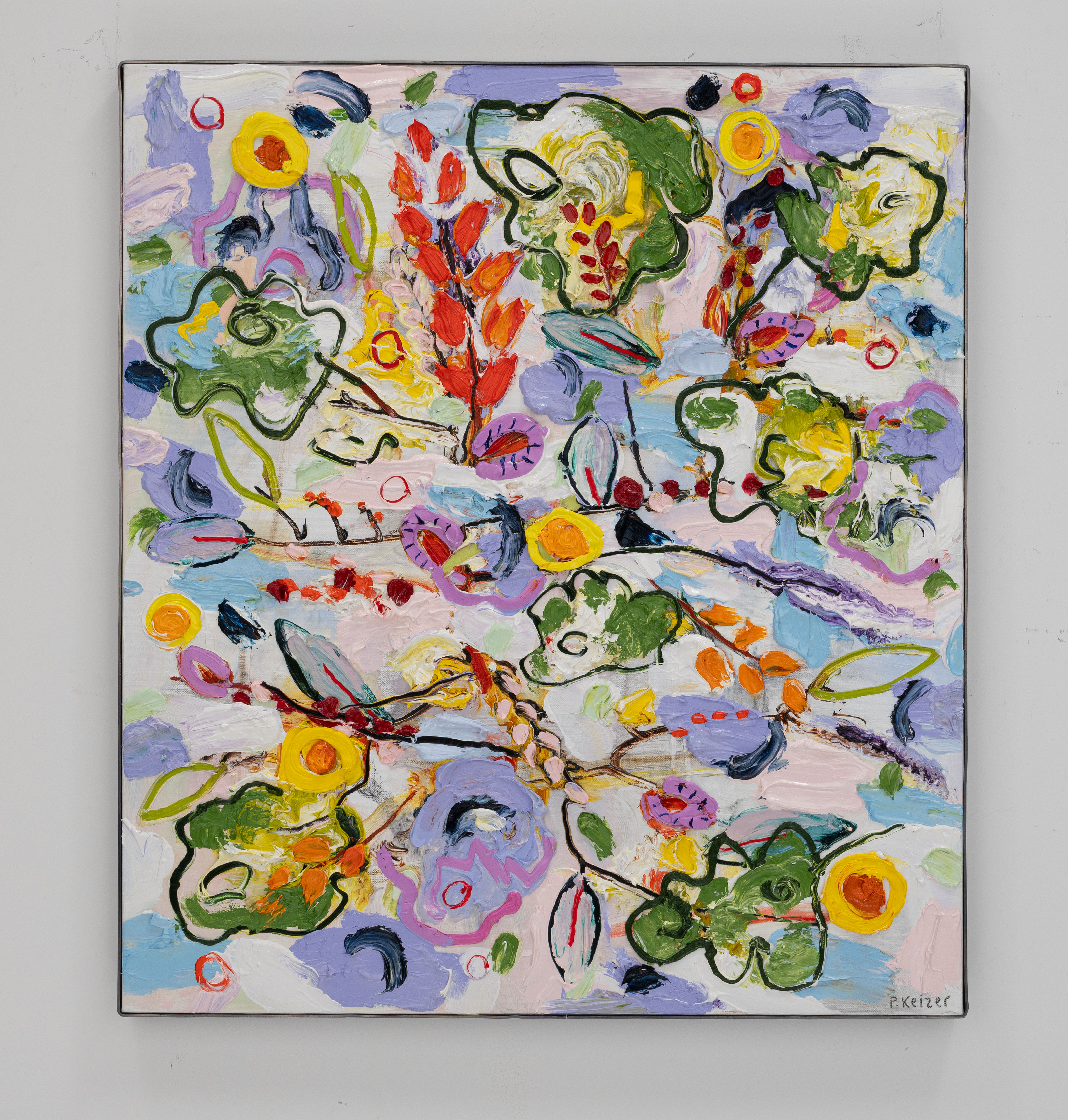 À la fois magnifique et absurde, le travail de Peter Keizer porte sur un monde où seuls des sentiments positifs surgissent : remplis de fleurs, d'arbres, de paysages montagneux et de chiens. Ses thèmes sont étroitement liés aux souvenirs d'enfance, comme si le temps avait transformé ses souvenirs en oeuvres d'art idéalisées et colorées. La peinture à l'huile épaisse est surtout utilisée directement à l'extérieur du tube, et donne un aspect sculptural aux tableaux : ce qui renforce la présence des couleurs. "Allongez-vous sur l'herbe et levez les yeux vers les arbres, si vous avez un esprit jeune, vous verrez ce que j'ai peint" - dit Peter Keizer.