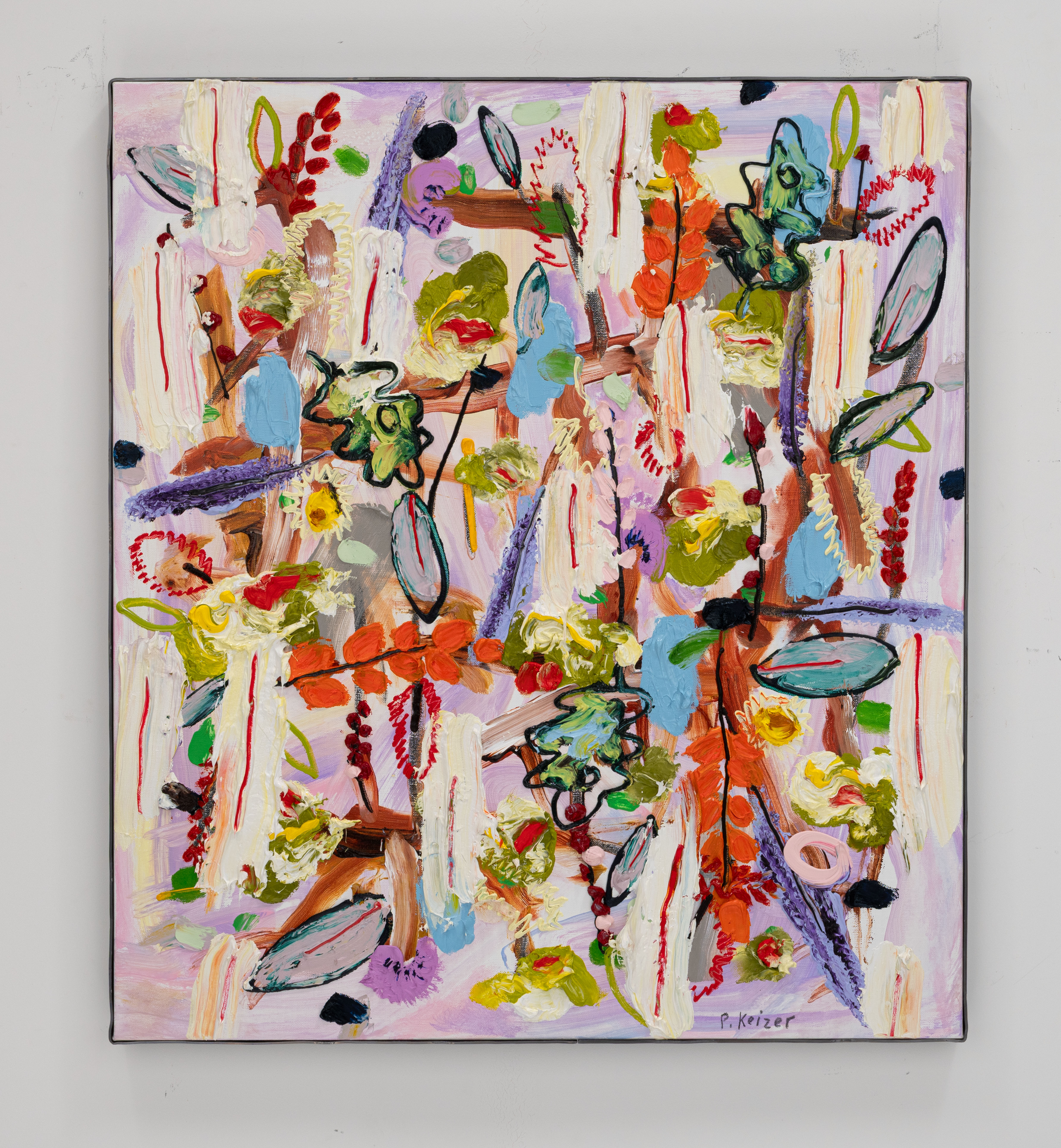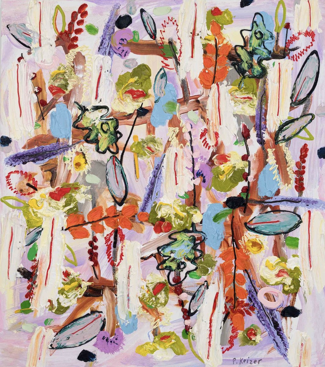 À la fois magnifique et absurde, le travail de Peter Keizer porte sur un monde où seuls des sentiments positifs surgissent : remplis de fleurs, d'arbres, de paysages montagneux et de chiens. Ses thèmes sont étroitement liés aux souvenirs d'enfance, comme si le temps avait transformé ses souvenirs en oeuvres d'art idéalisées et colorées. La peinture à l'huile épaisse est surtout utilisée directement à l'extérieur du tube, et donne un aspect sculptural aux tableaux : ce qui renforce la présence des couleurs. "Allongez-vous sur l'herbe et levez les yeux vers les arbres, si vous avez un esprit jeune, vous verrez ce que j'ai peint" - dit Peter Keizer.