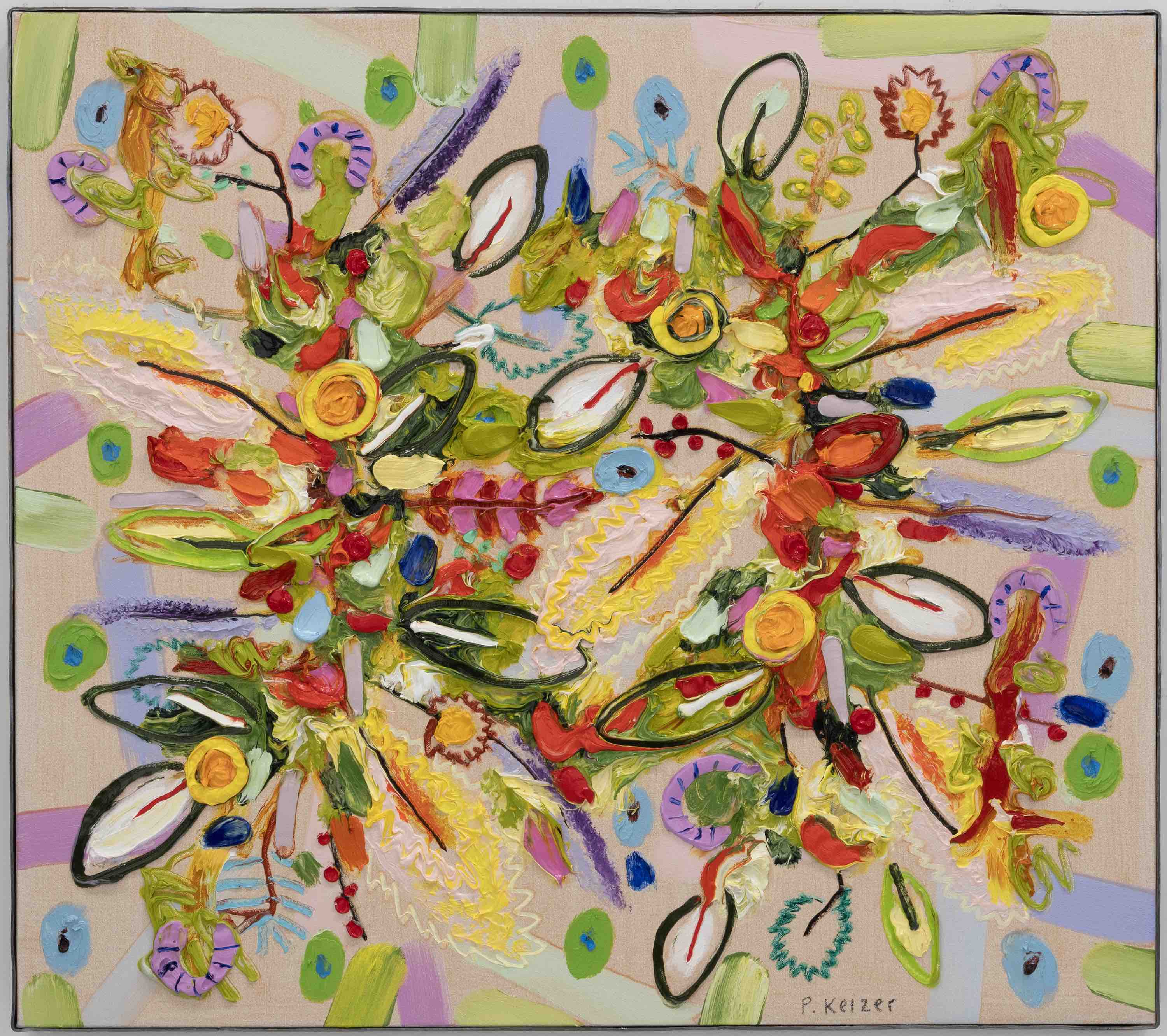 À la fois magnifique et absurde, le travail de Peter Keizer porte sur un monde où seuls des sentiments positifs surgissent : remplis de fleurs, d'arbres, de paysages montagneux et de chiens. Ses thèmes sont étroitement liés aux souvenirs d'enfance, comme si le temps avait transformé ses souvenirs en oeuvres d'art idéalisées et colorées. La peinture à l'huile épaisse est surtout utilisée directement à l'extérieur du tube, et donne un aspect sculptural aux tableaux : ce qui renforce la présence des couleurs. "Allongez-vous sur l'herbe et levez les yeux vers les arbres, si vous avez un esprit jeune, vous verrez ce que j'ai peint" - dit Peter Keizer.