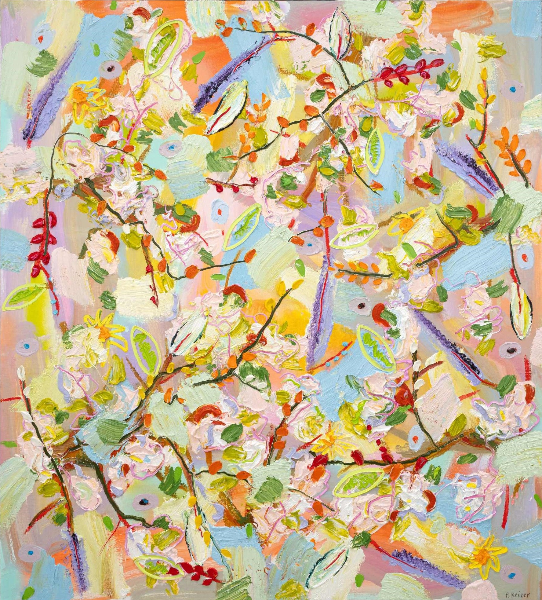 À la fois magnifique et absurde, le travail de Peter Keizer porte sur un monde où seuls des sentiments positifs surgissent : remplis de fleurs, d'arbres, de paysages montagneux et de chiens. Ses thèmes sont étroitement liés aux souvenirs d'enfance, comme si le temps avait transformé ses souvenirs en oeuvres d'art idéalisées et colorées. La peinture à l'huile épaisse est surtout utilisée directement à l'extérieur du tube, et donne un aspect sculptural aux tableaux : ce qui renforce la présence des couleurs. "Allongez-vous sur l'herbe et levez les yeux vers les arbres, si vous avez un esprit jeune, vous verrez ce que j'ai peint" - dit Peter Keizer.