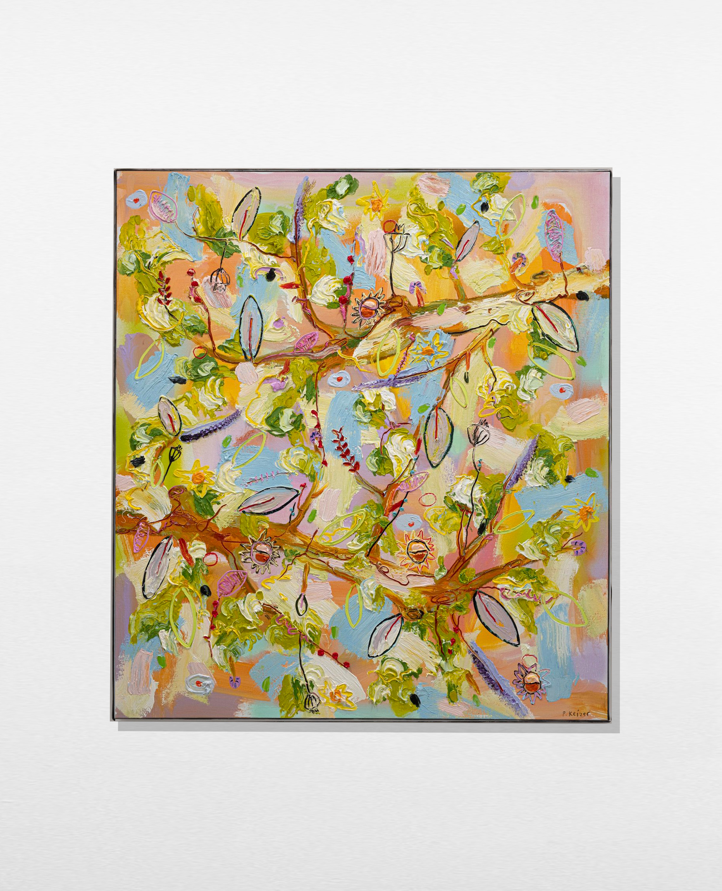 À la fois magnifique et absurde, le travail de Peter Keizer porte sur un monde où seuls des sentiments positifs surgissent : remplis de fleurs, d'arbres, de paysages montagneux et de chiens. Ses thèmes sont étroitement liés aux souvenirs d'enfance, comme si le temps avait transformé ses souvenirs en oeuvres d'art idéalisées et colorées. La peinture à l'huile épaisse est surtout utilisée directement à l'extérieur du tube, et donne un aspect sculptural aux tableaux : ce qui renforce la présence des couleurs. "Allongez-vous sur l'herbe et levez les yeux vers les arbres, si vous avez un esprit jeune, vous verrez ce que j'ai peint" - dit Peter Keizer.