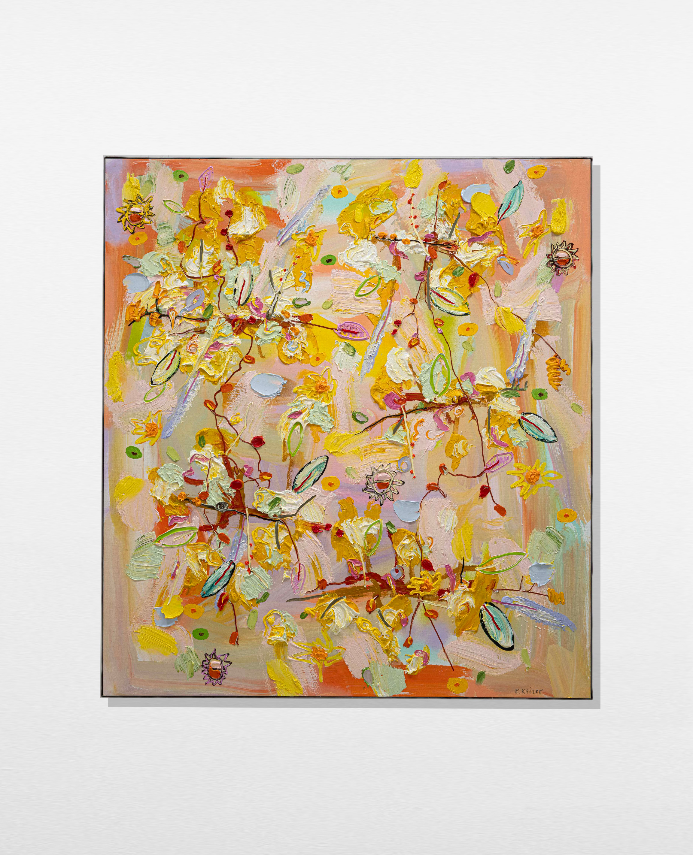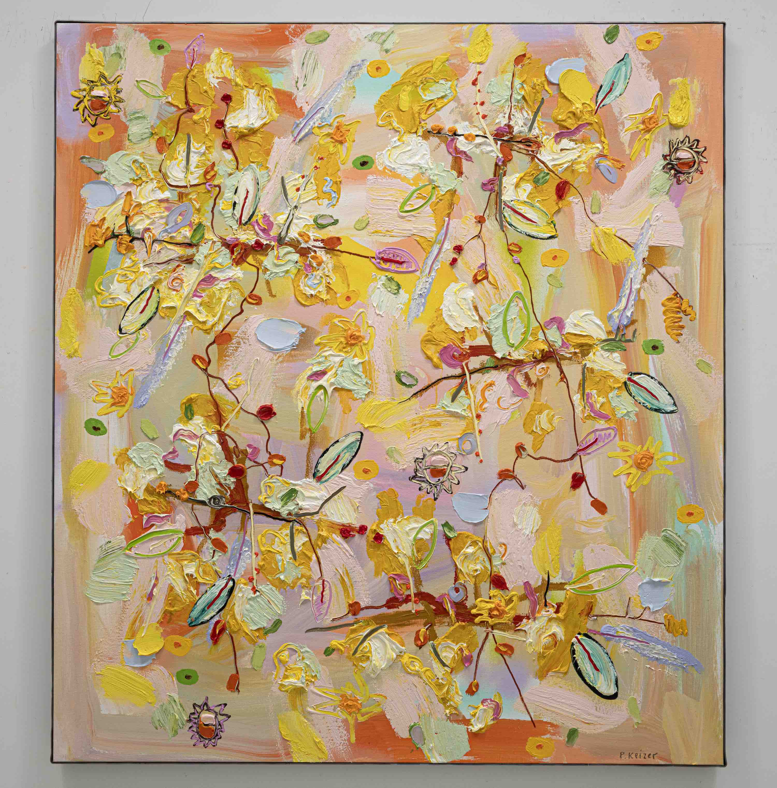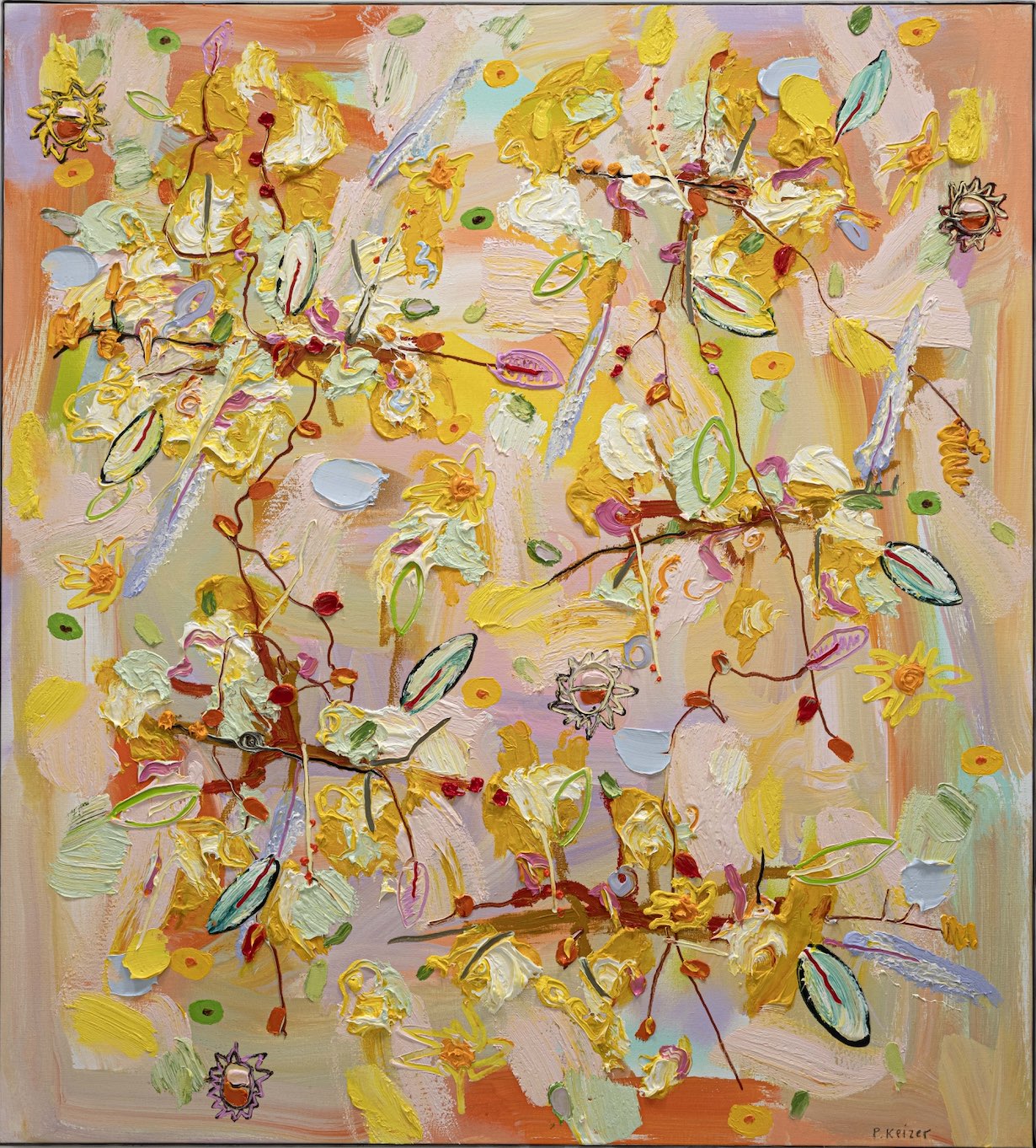 À la fois magnifique et absurde, le travail de Peter Keizer porte sur un monde où seuls des sentiments positifs surgissent : remplis de fleurs, d'arbres, de paysages montagneux et de chiens. Ses thèmes sont étroitement liés aux souvenirs d'enfance, comme si le temps avait transformé ses souvenirs en oeuvres d'art idéalisées et colorées. La peinture à l'huile épaisse est surtout utilisée directement à l'extérieur du tube, et donne un aspect sculptural aux tableaux : ce qui renforce la présence des couleurs. "Allongez-vous sur l'herbe et levez les yeux vers les arbres, si vous avez un esprit jeune, vous verrez ce que j'ai peint" - dit Peter Keizer.