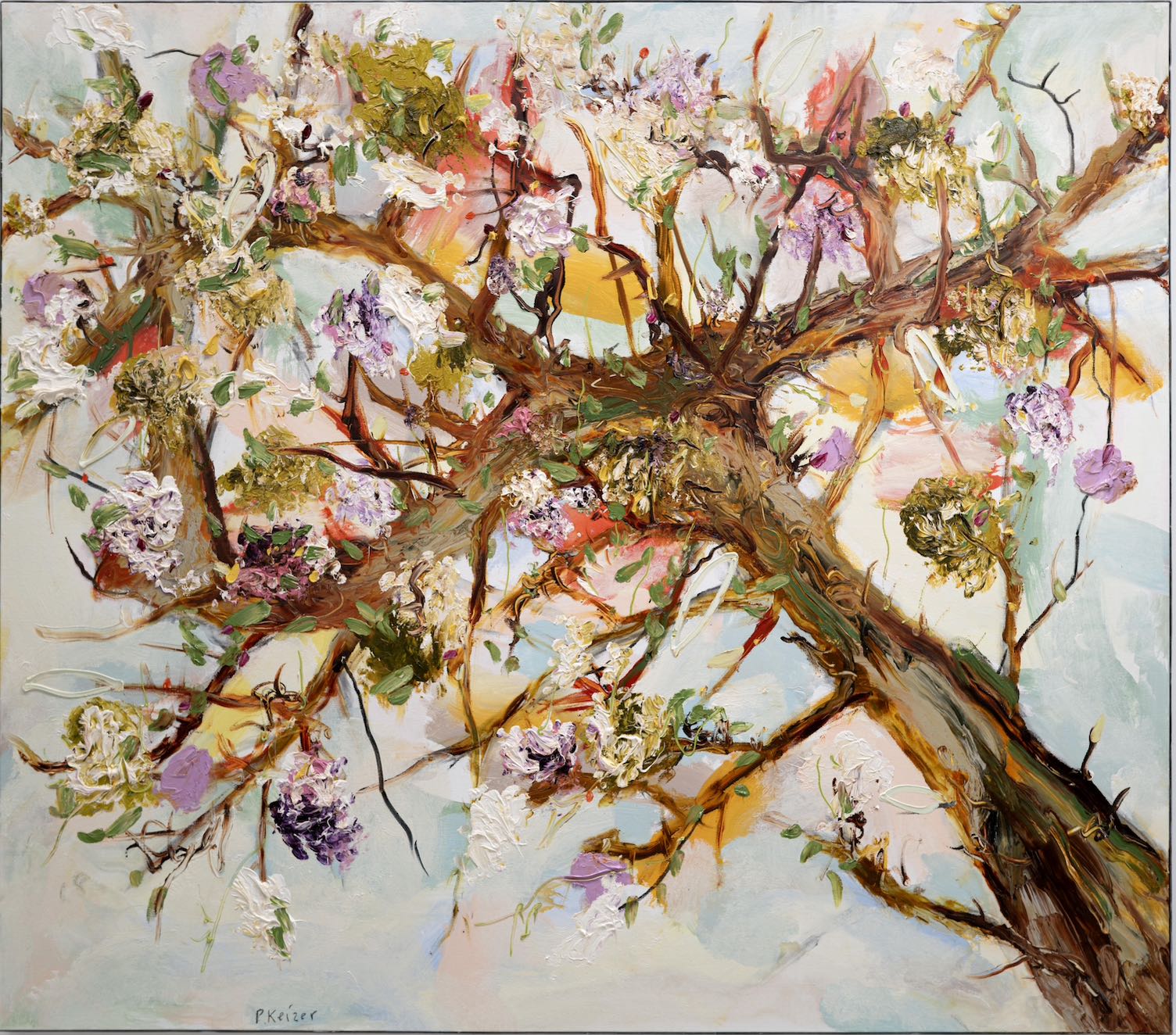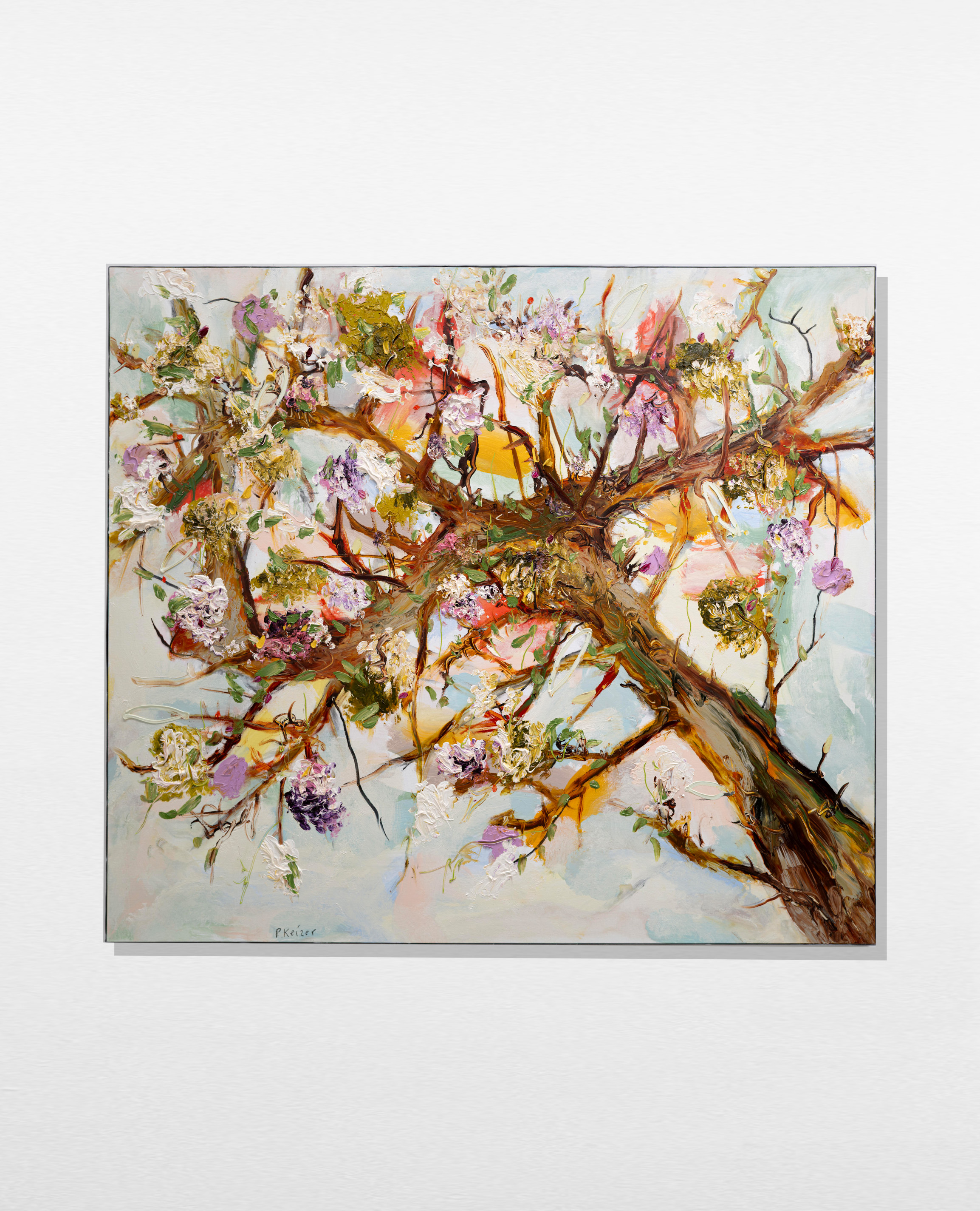 À la fois magnifique et absurde, le travail de Peter Keizer porte sur un monde où seuls des sentiments positifs surgissent : remplis de fleurs, d'arbres, de paysages montagneux et de chiens. Ses thèmes sont étroitement liés aux souvenirs d'enfance, comme si le temps avait transformé ses souvenirs en oeuvres d'art idéalisées et colorées. La peinture à l'huile épaisse est surtout utilisée directement à l'extérieur du tube, et donne un aspect sculptural aux tableaux : ce qui renforce la présence des couleurs. "Allongez-vous sur l'herbe et levez les yeux vers les arbres, si vous avez un esprit jeune, vous verrez ce que j'ai peint" - dit Peter Keizer.