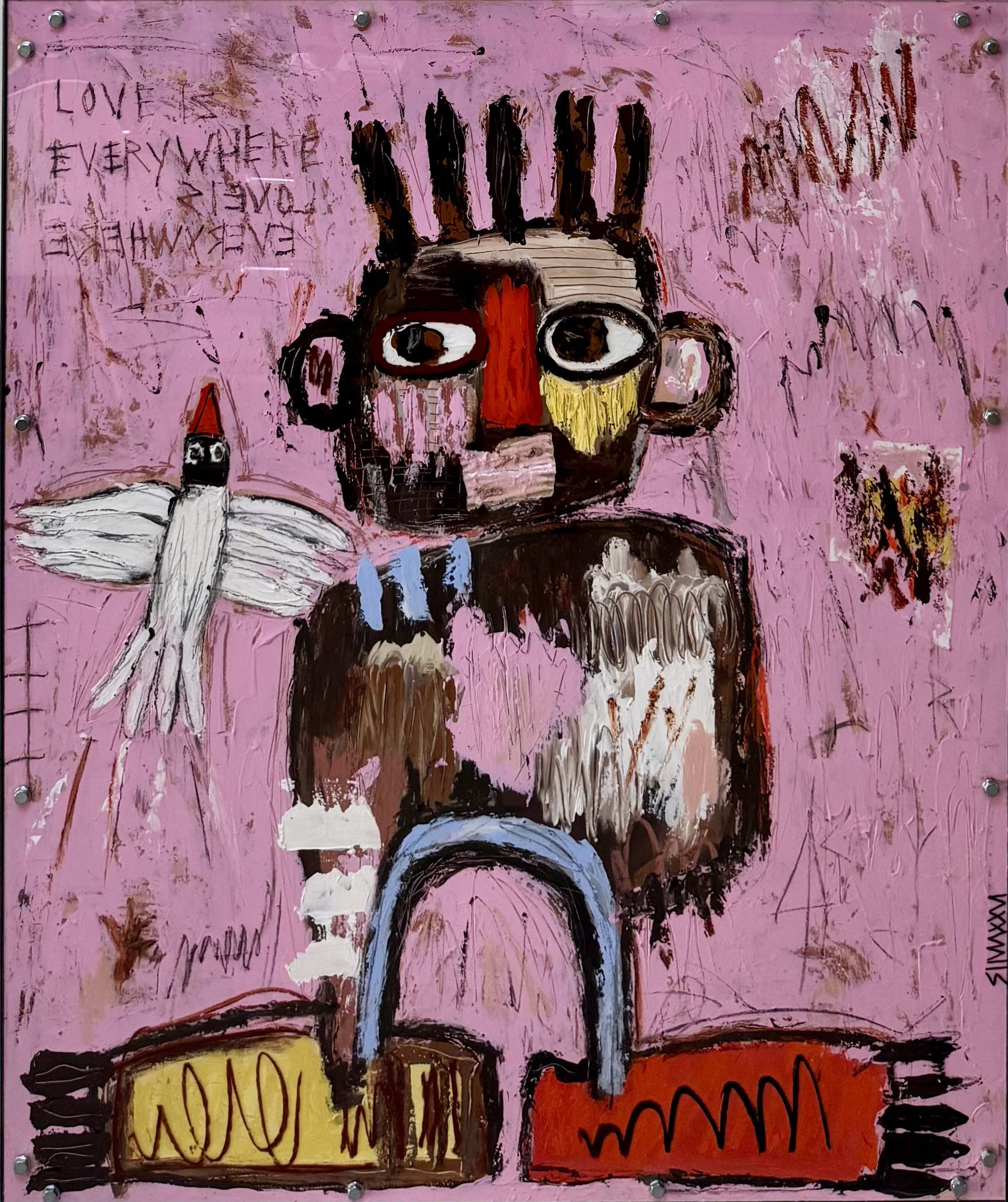 Inspirée par Basquiat, Rauschenberg ou encore Combas, l'oeuvre de Silvia Calmejane n'en n'est pas pour autant impersonnelle. Dans chacune de ses compositions, ce sont des traces de son histoire, de ses voyages ou encore de de ses inspirations qu'elle dissémine au gré du pinceau. Les mots dispersés dans ses oeuvres, mystérieuses incantations, rappellent ainsi les slogans hippies des années 1970, période chère au coeur de l'artiste.